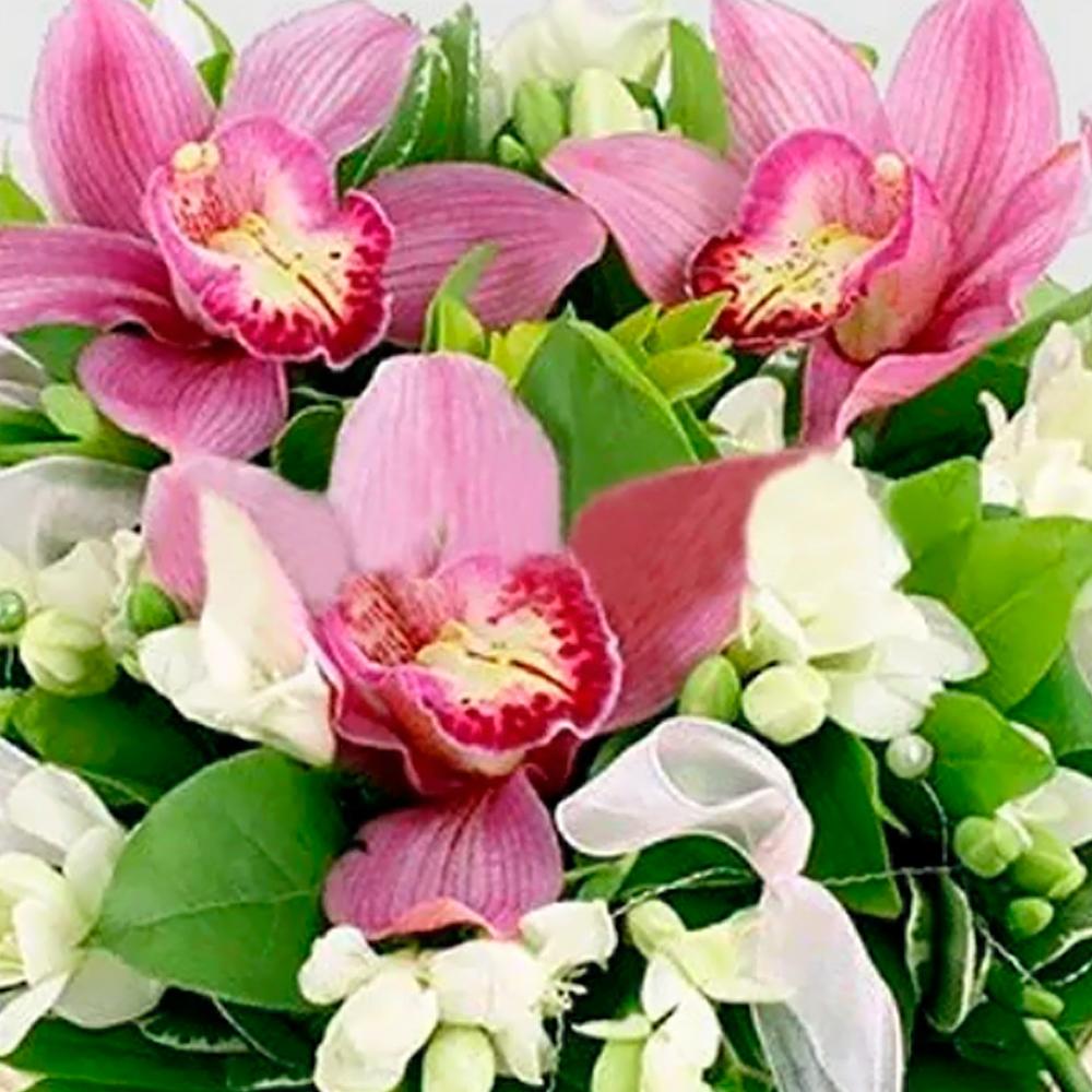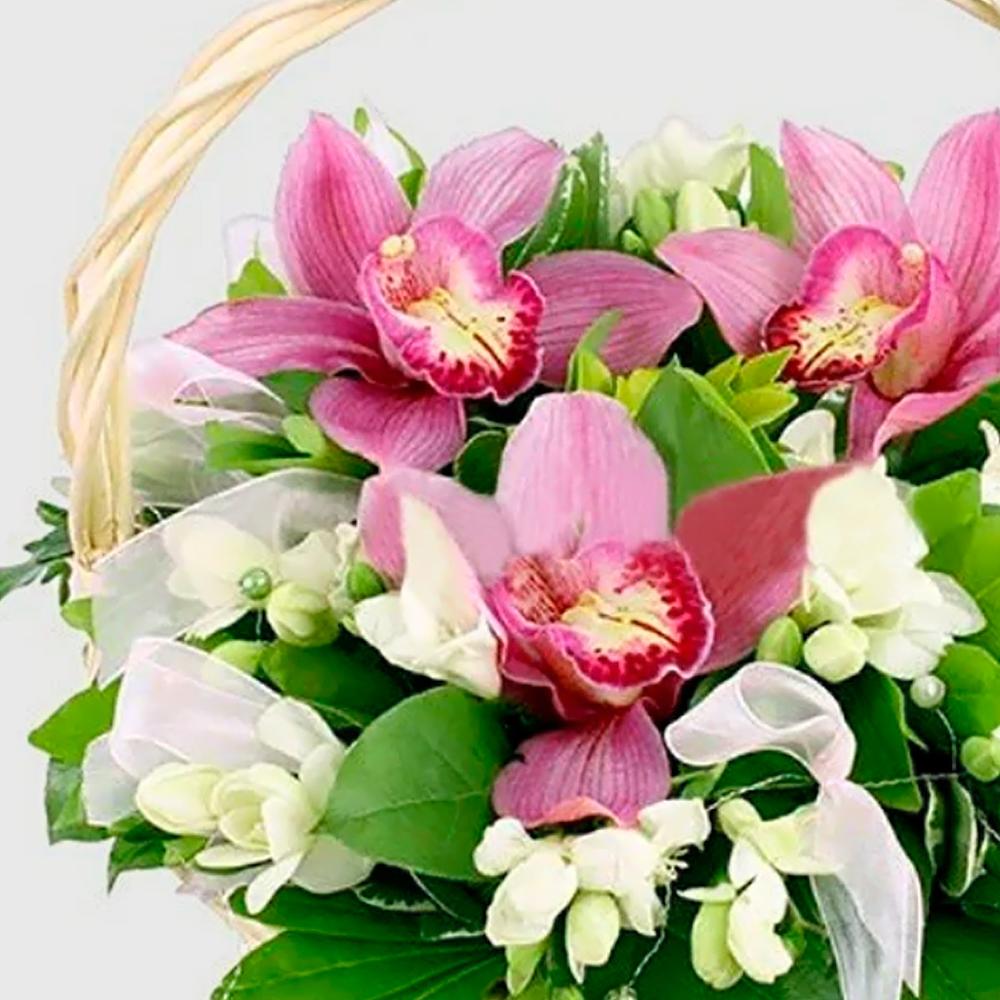 Орхидея цимбидиум бутон – 3 шт.Фрезия – 10 шт.Зелень – 10 шт.Декор флористический – 7 шт.Корзина – 1 шт.Пиафлор (оазис) – 2 шт.