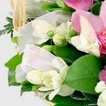 Нежная, трогательная композиция из орхидей цимбидиум и белоснежных фрезий в корзинке. Ансамбль дополнен зеленью и декоративными элементами из лент и бусин. Для самых очаровательных принцесс! Аромат фрезий настолько притягателен, что получательниц не захочет выпускать такую корзинку из рук 🙂 Подарите кучу позитивных эмоций дорогому человеку!