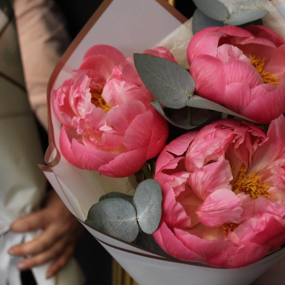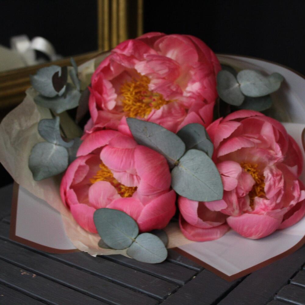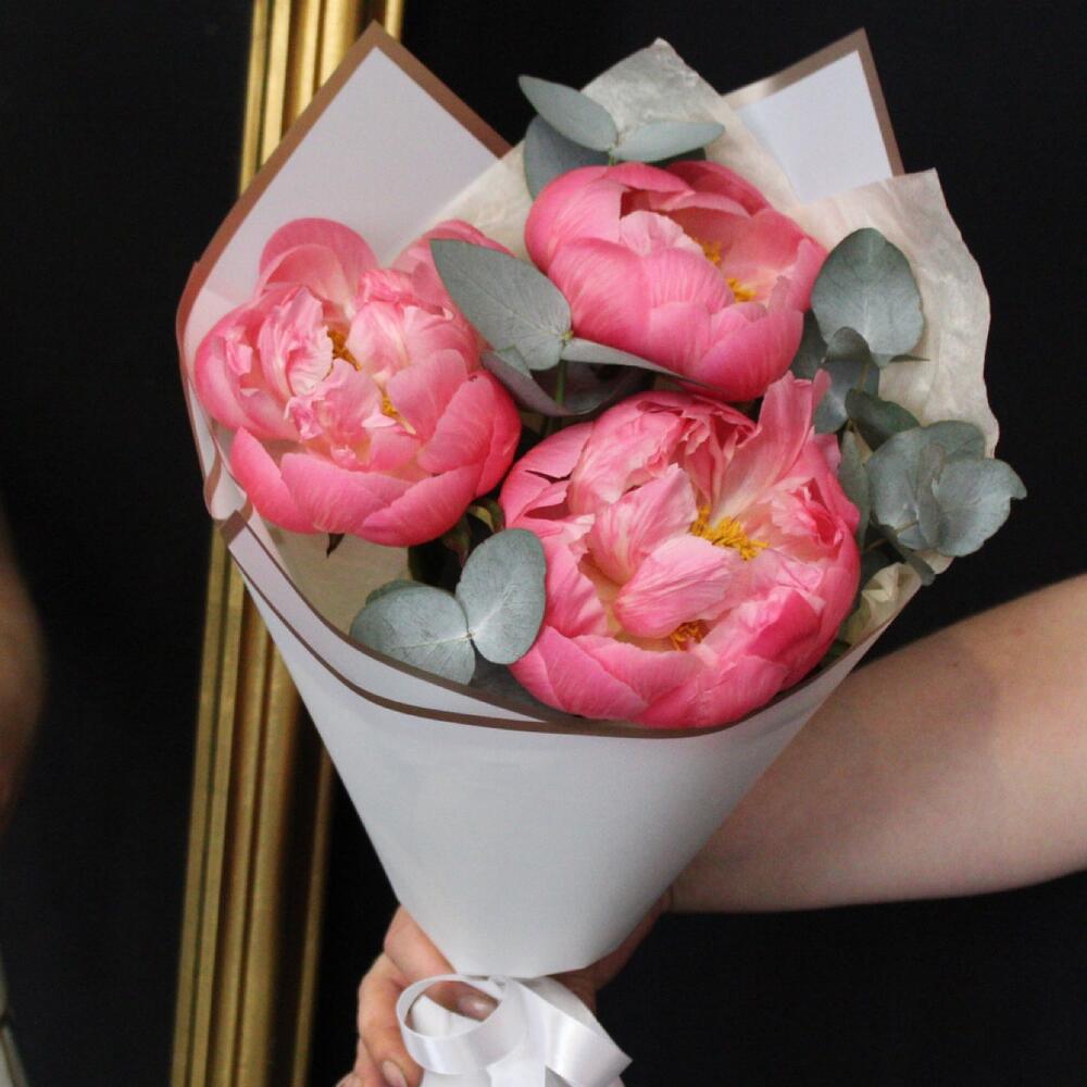 Эвкалипт – 2 шт.Лента атласная – 2 шт.Тишью – 1 шт.Пленка матовая – 1 шт.Пион коралл шарм – 3 шт.