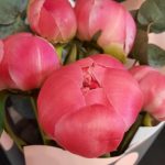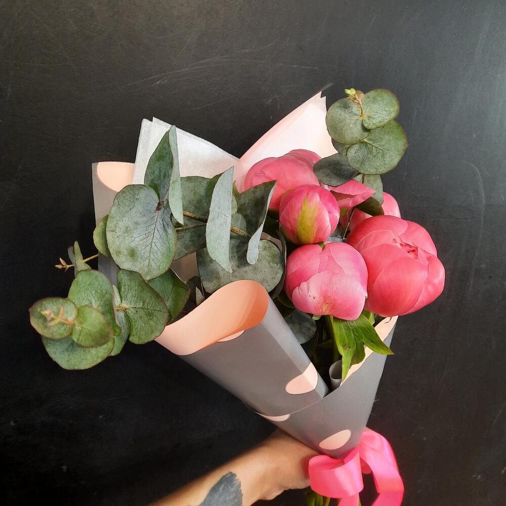Пион Коралл Шарм (Coral Charm) – 5 шт.Эвкалипт – 1 шт.Упаковка дизайнерская – 1 шт.