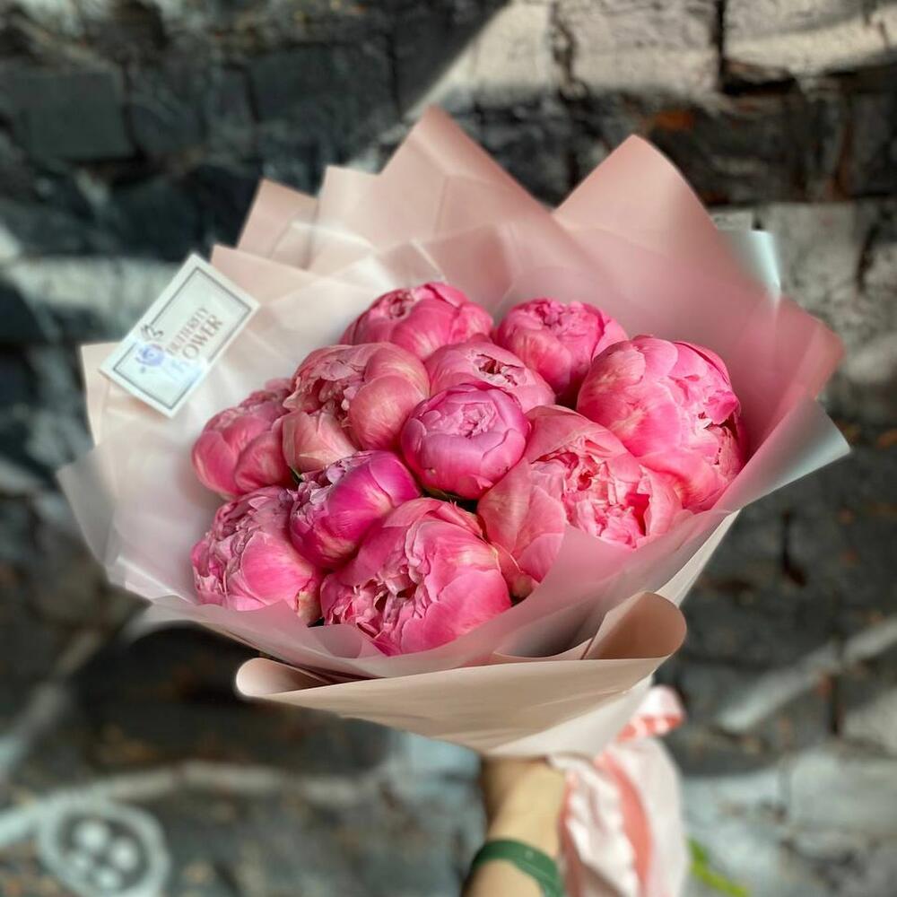 Букет из 11 ярко-розовых пионов в дизайнерской упаковке "Феликс Суприм"
