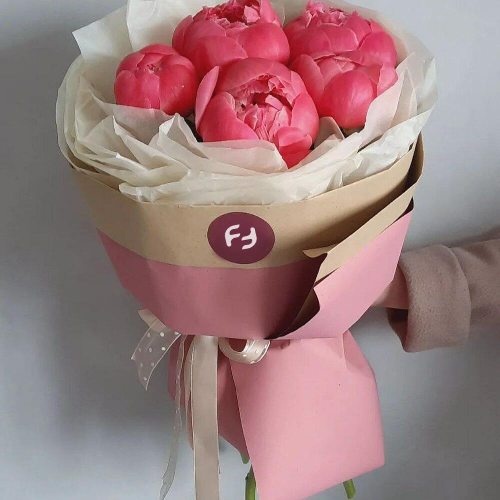 Лента атласная – 2 шт.Тишью – 2 шт.Пион coral sunset – 5 шт.Корейская пленка – 2 шт.