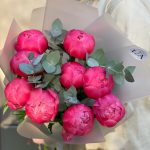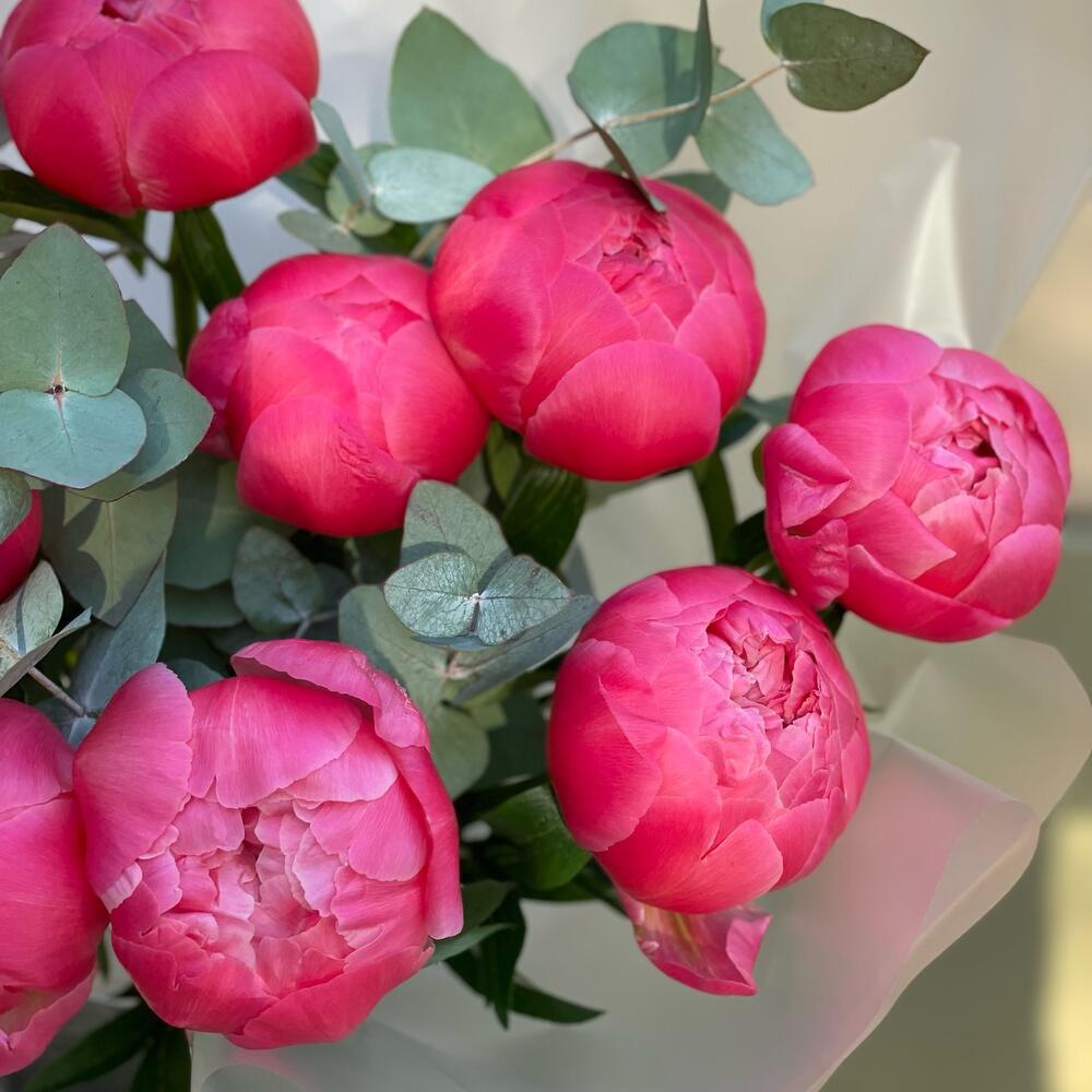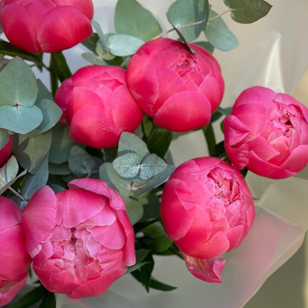 Пион Коралл Шарм (Coral Charm) – 9 шт.Эвкалипт – 4 шт.Лента атласная – 2 шт.Упаковка дизайнерская – 4 шт.