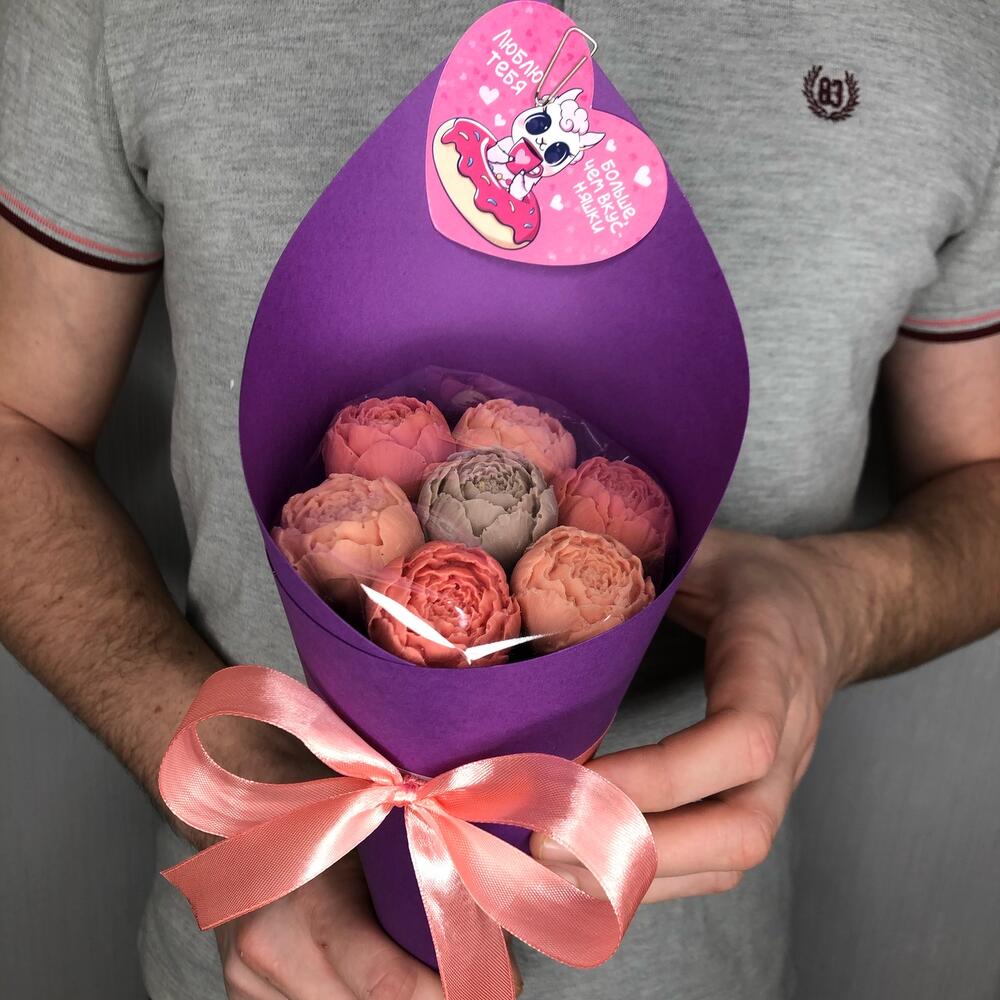 Мини открытка – 1 шт.шоколадные пионы из бельгийского шоколада – 7 шт.