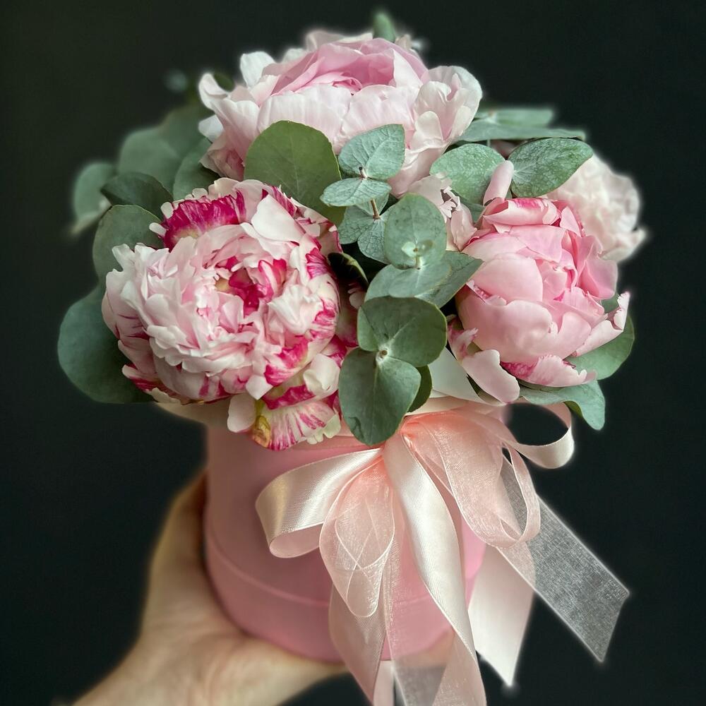 Цветы в коробке из 5 пионов и эвкалипта