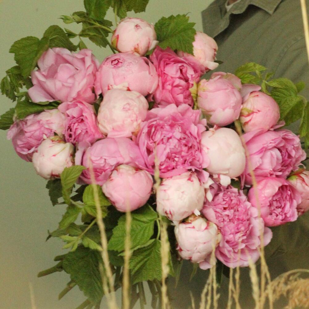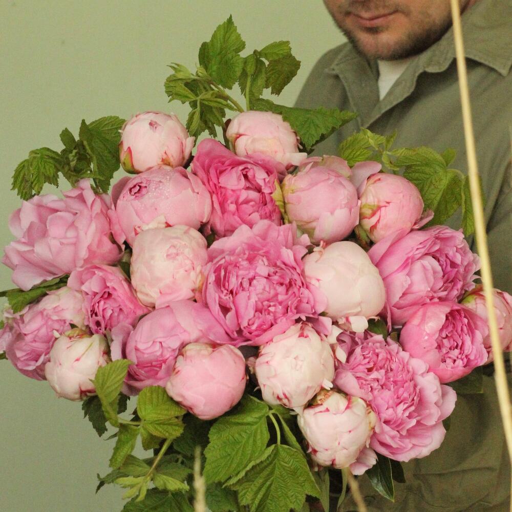 Охапка нежных пионов с веточками малины.