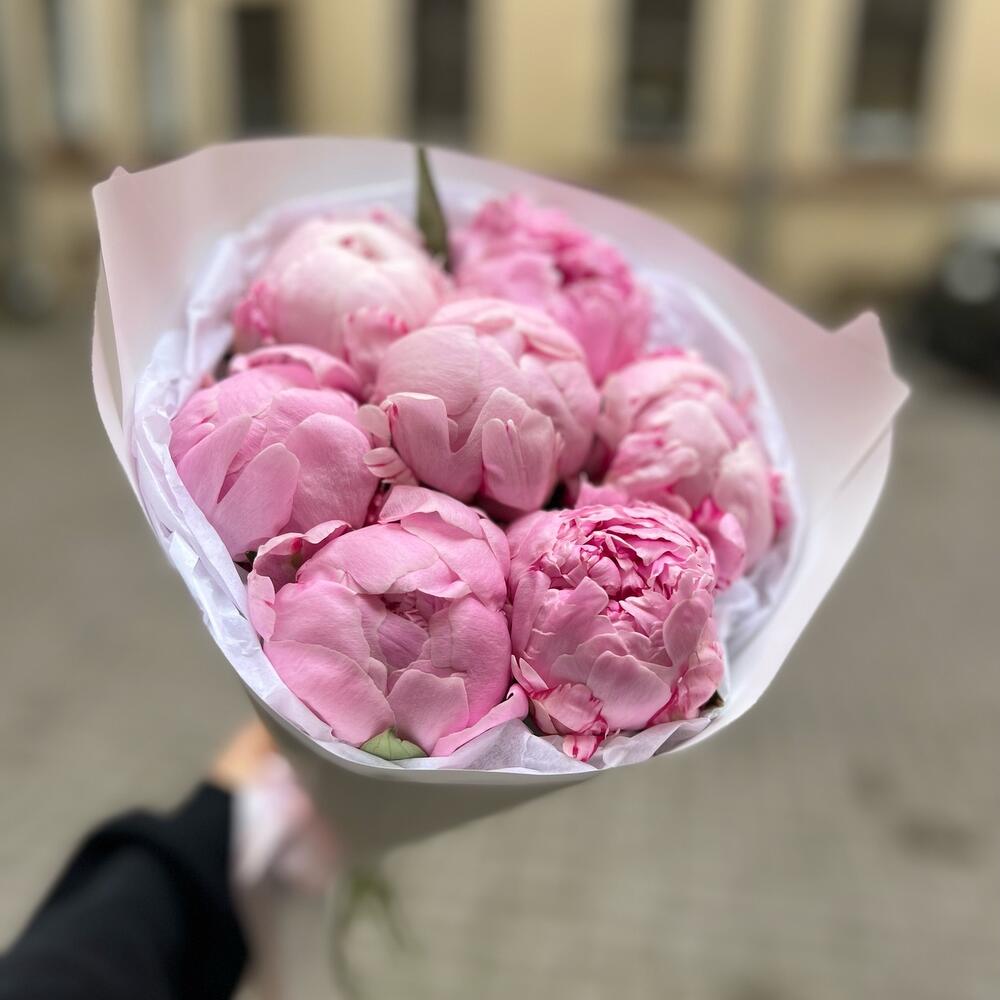 Упаковка – 2 шт.Лента атласная – 1 шт.Пион Сара Бернар розовый – 7 шт.