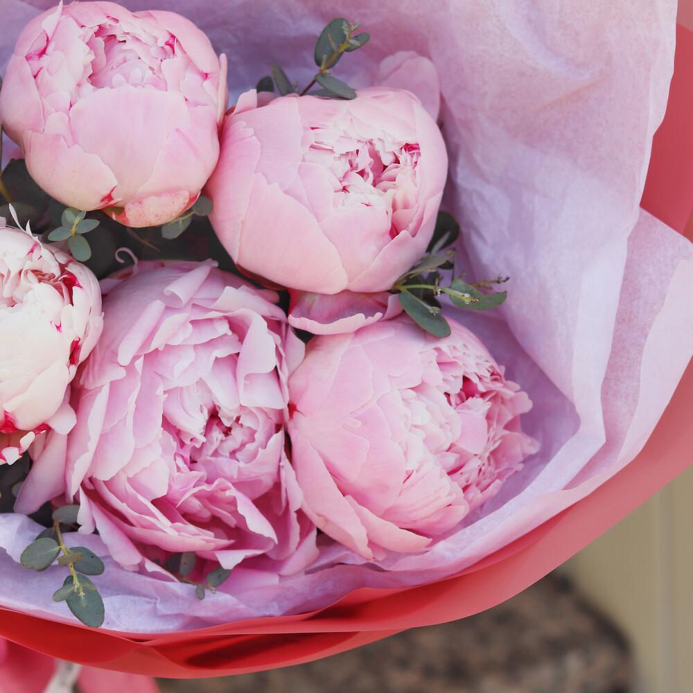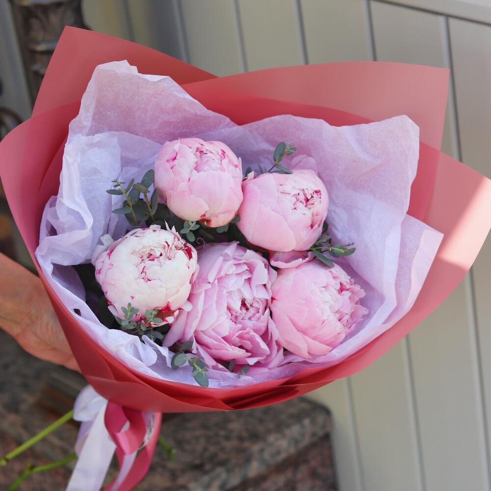 Премиум букет из 5 розовых пионов и эвкалипта