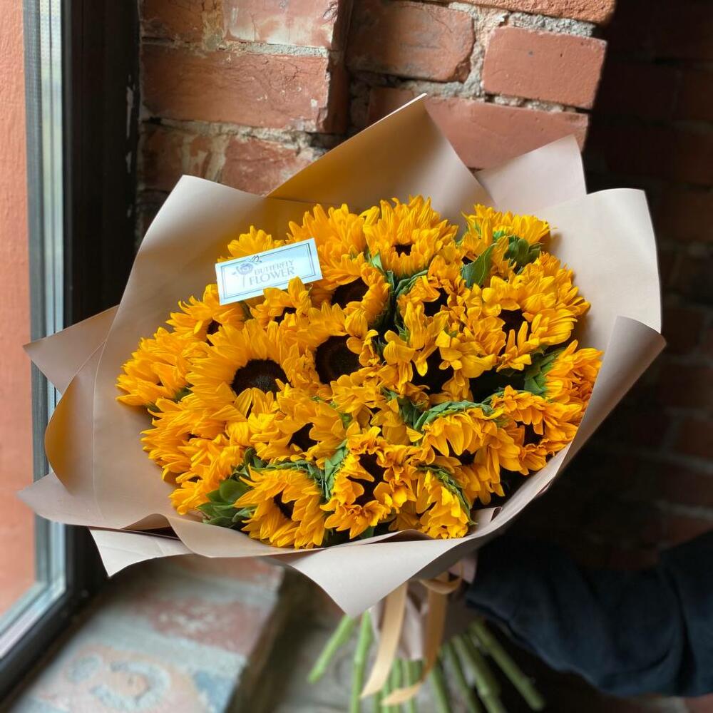 Букет из 27 подсолнухов в стильной упаковке “Аполлон”