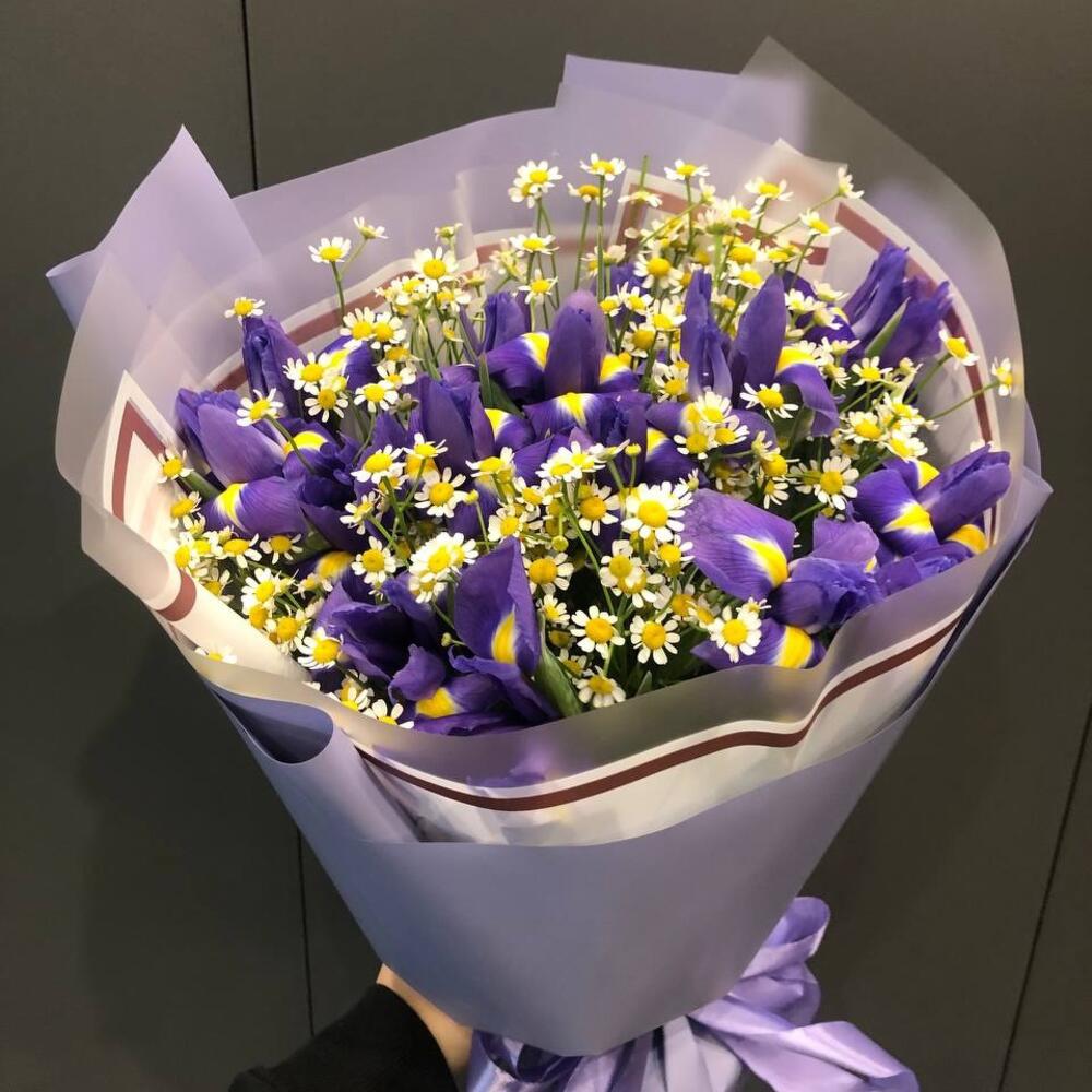 Ирис – 15 шт.Ромашка – 8 шт.Упаковка матовая – 1 шт.Лента атласная – 1 шт.
