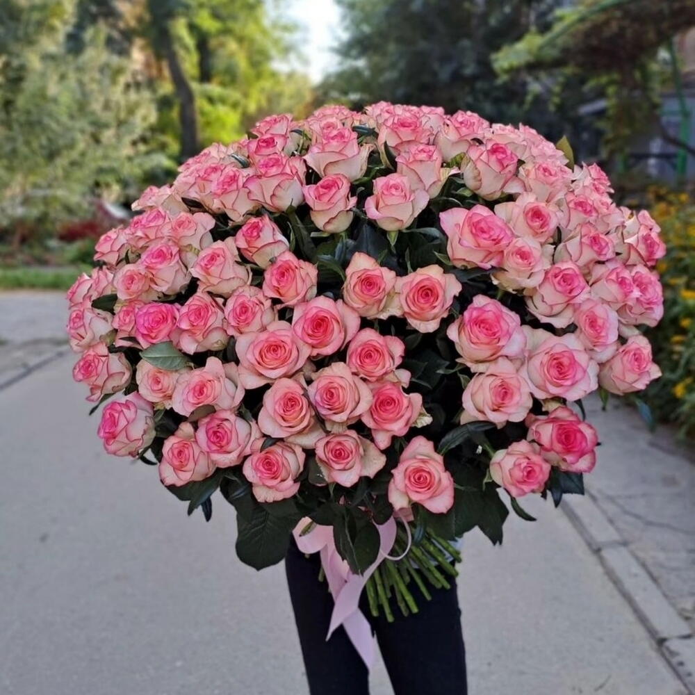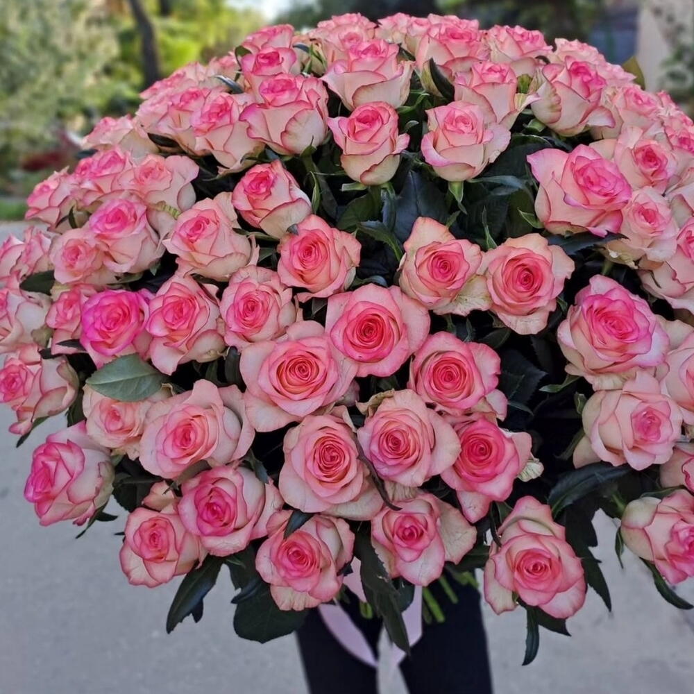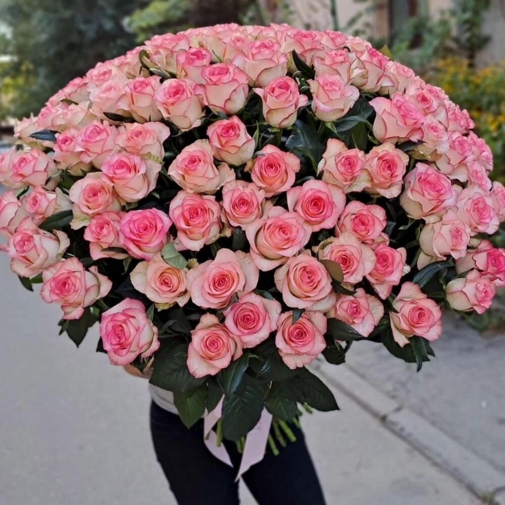Роскошный букет из 101 нежной бело-розовой розы сорта Джумилия будет прекрасным поводом напомнить о себе и рассказать о своих чувствах на языке любви.