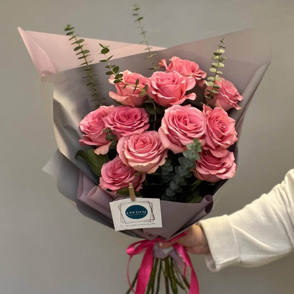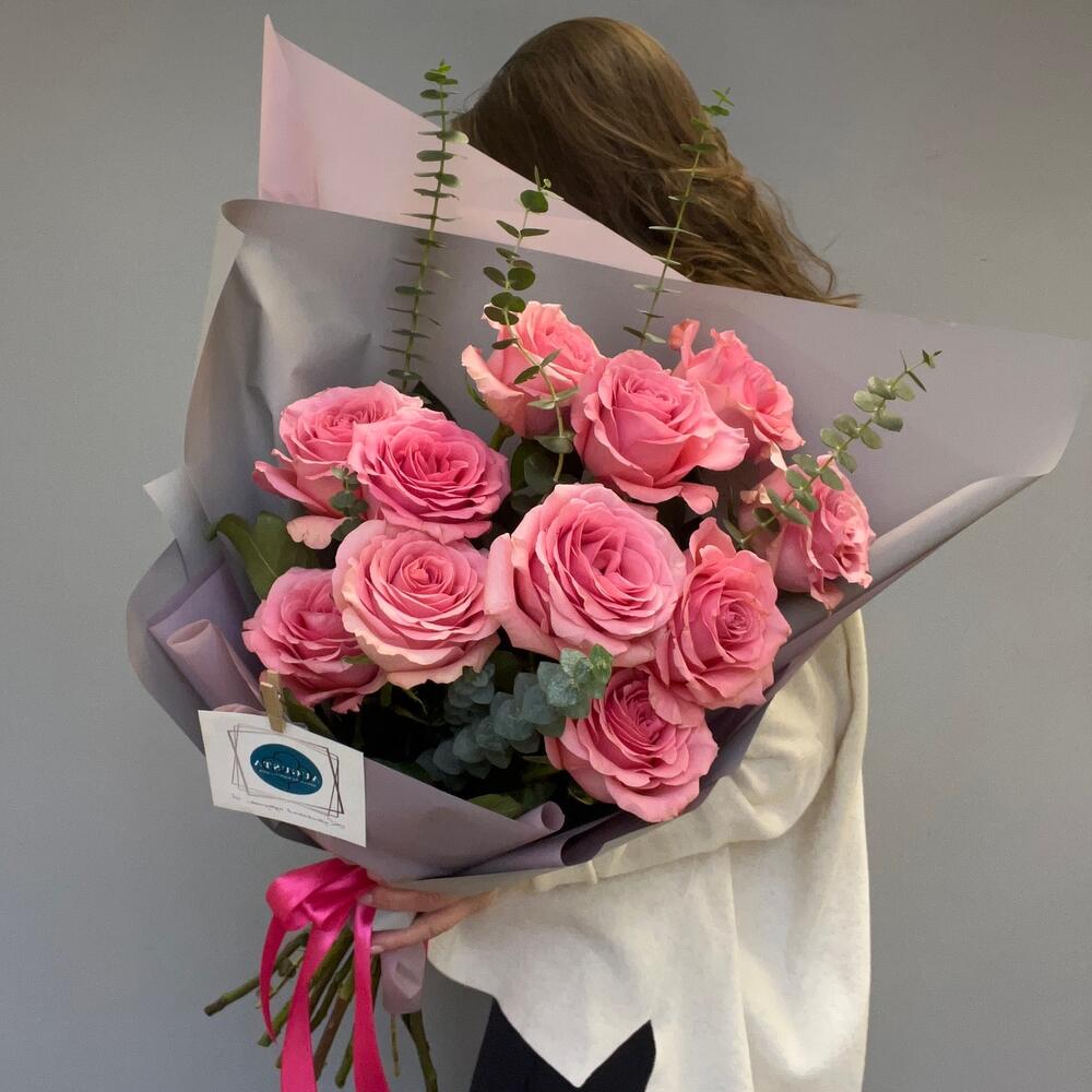 11 нежно-розовых роз с эвкалиптом