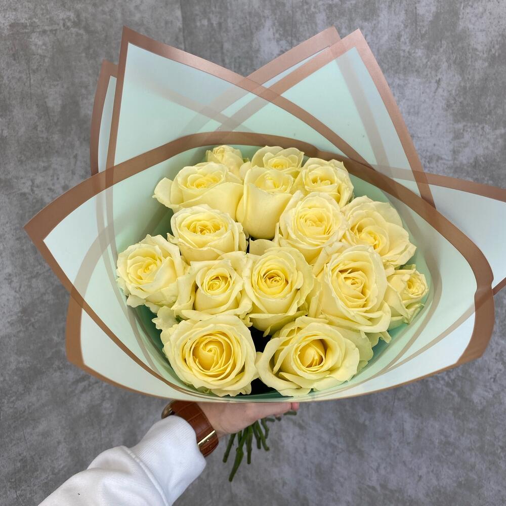 Роза – 15 шт.Корейская упаковка – 3 шт.Атласная лента – 1 шт.