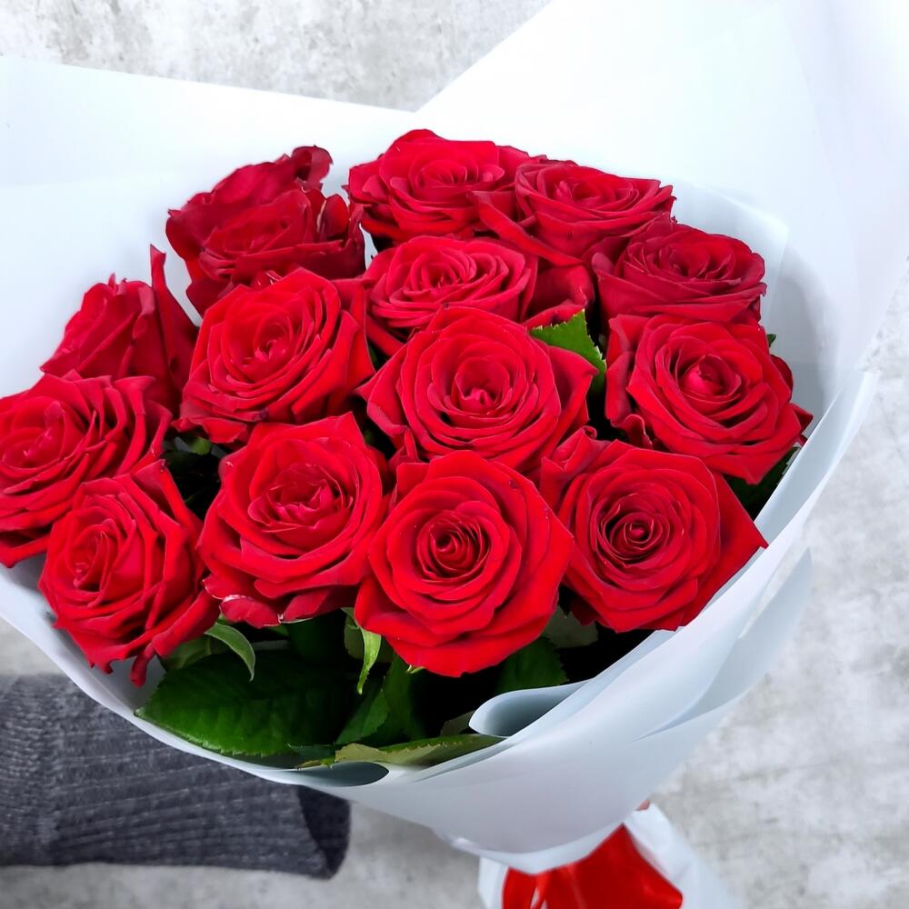 15 красных роз в блестящей упаковке