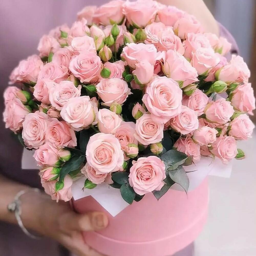 15 нежных кустовых роз в розовой шляпной коробке