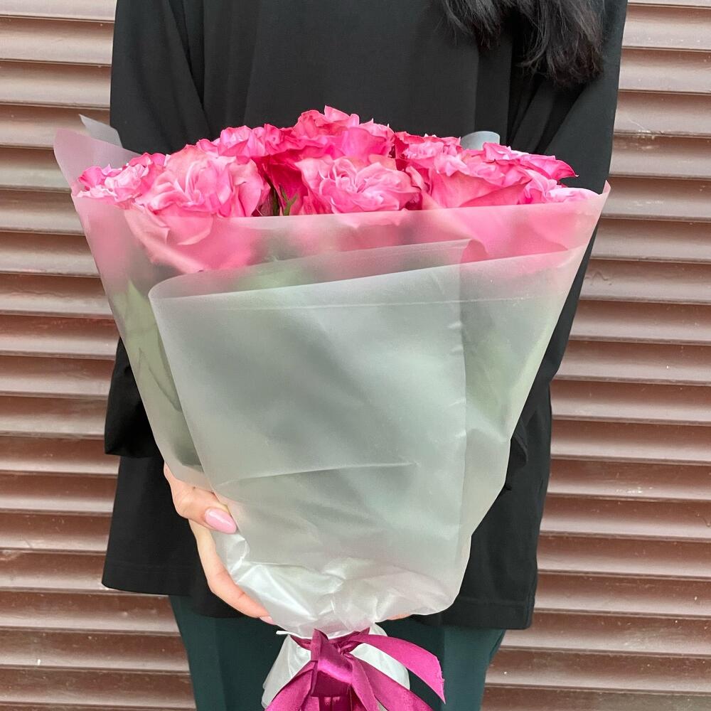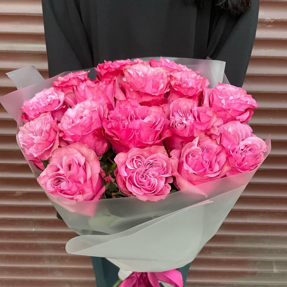 Лента атласная – 1 шт.Упаковка дизайнерская – 1 шт.розы пионовидные – 15 шт.
