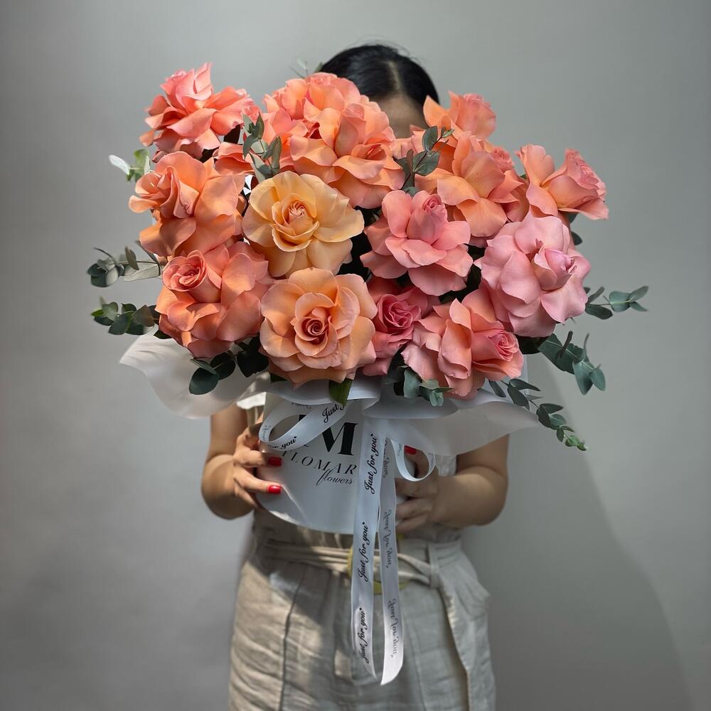 Композиция из ароматных роз и эвкалипта в брендированной шляпной коробке