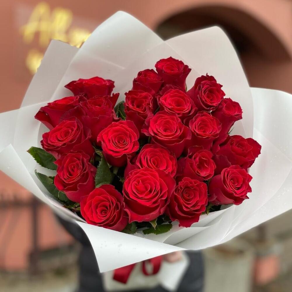 Роза красная – 21 шт. Открыточка с вашими пожеланиями – 1 шт. Упаковка дизайнерская – 1 шт. инструкция по уходу за цветами – 1 шт.