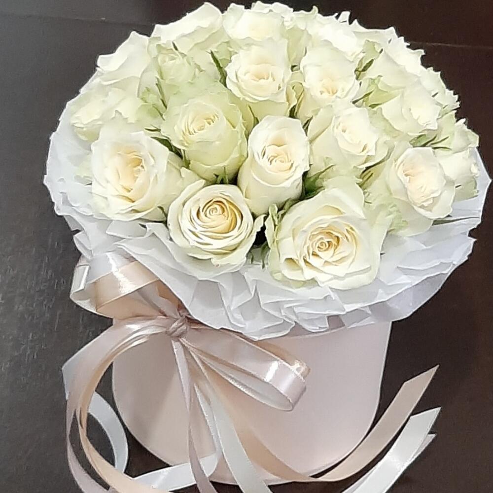 Роза – 25 шт.Шляпная коробка с лентами – 1 шт.Оазис флористический – 1 шт.