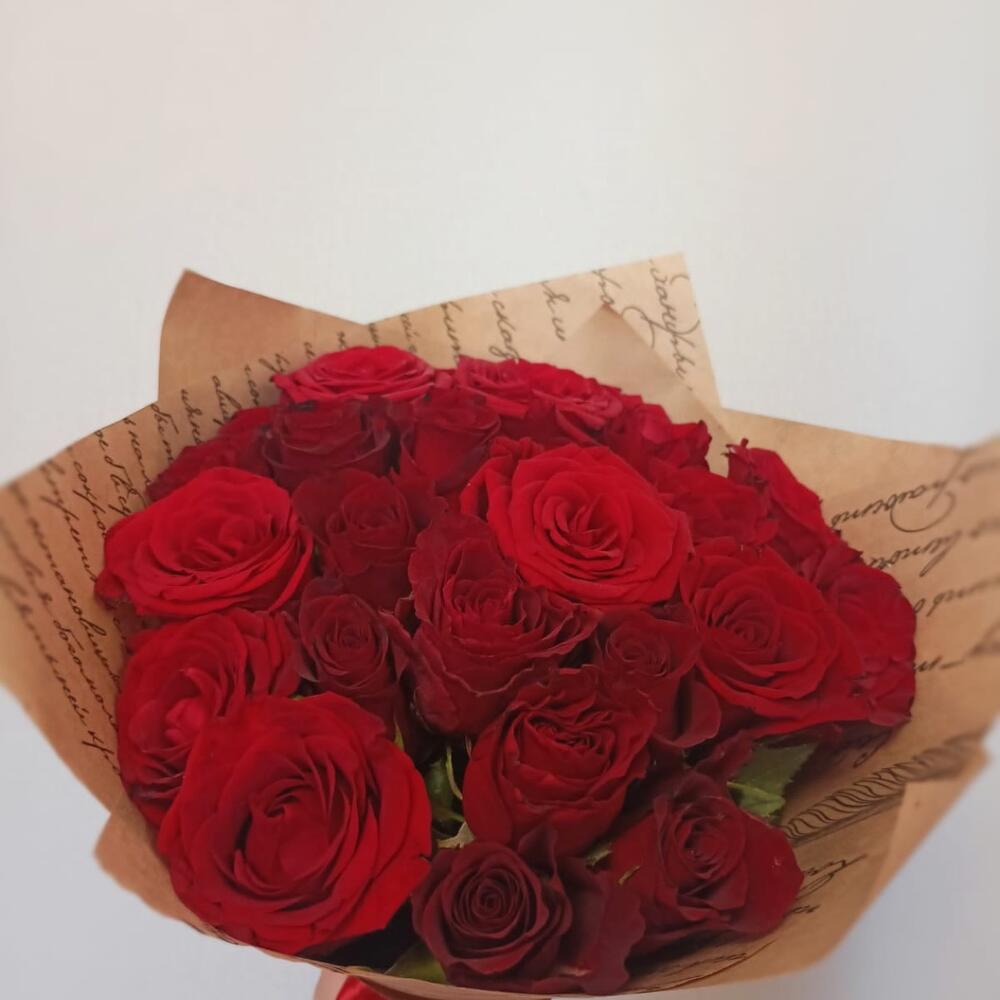 Роза – 25 шт.Упаковка дизайнерская – 1 шт.Лента атласная – 1 шт.