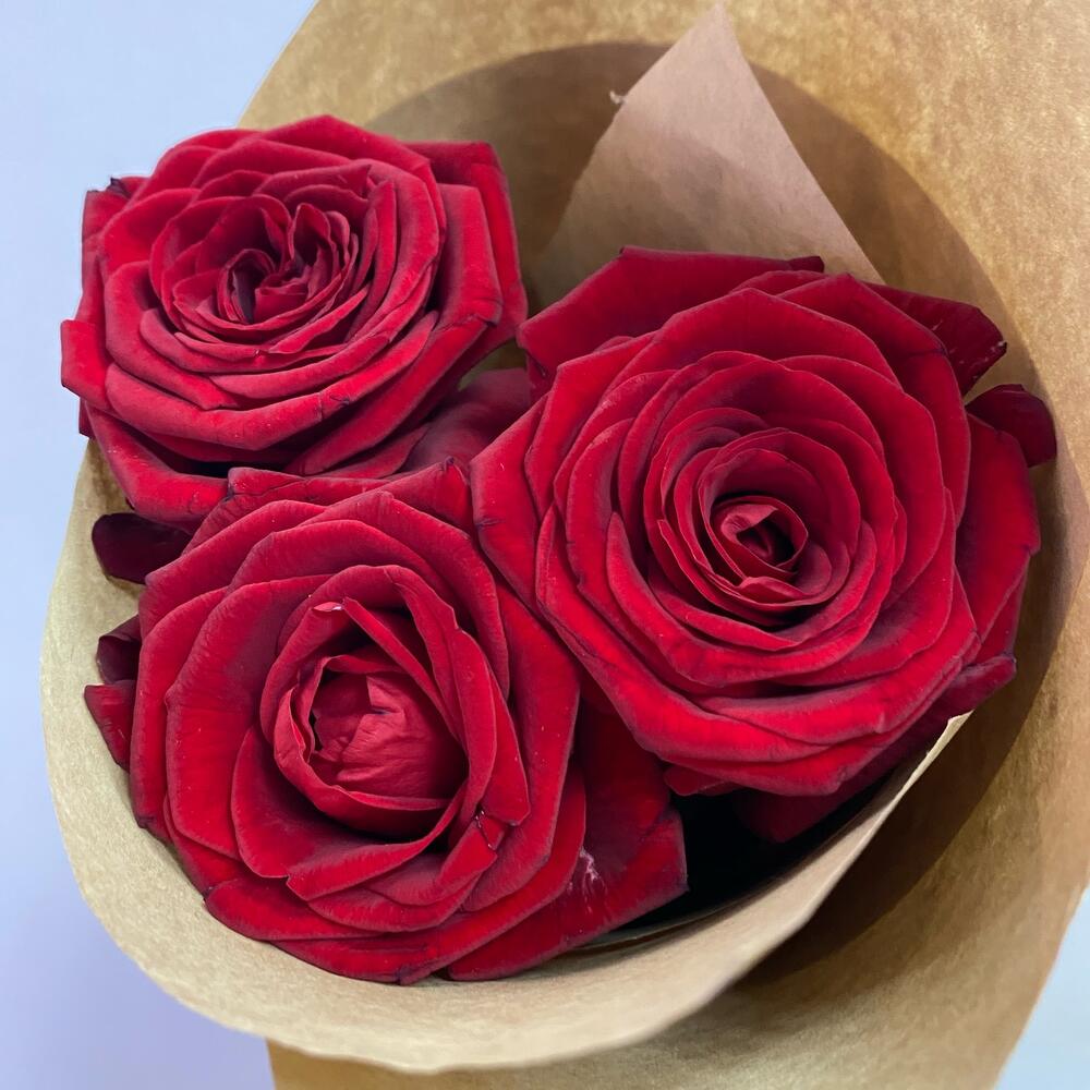 Роза красная – 3 шт.Крафт упаковка – 1 шт.Открыточка с вашими пожеланиями – 1 шт.