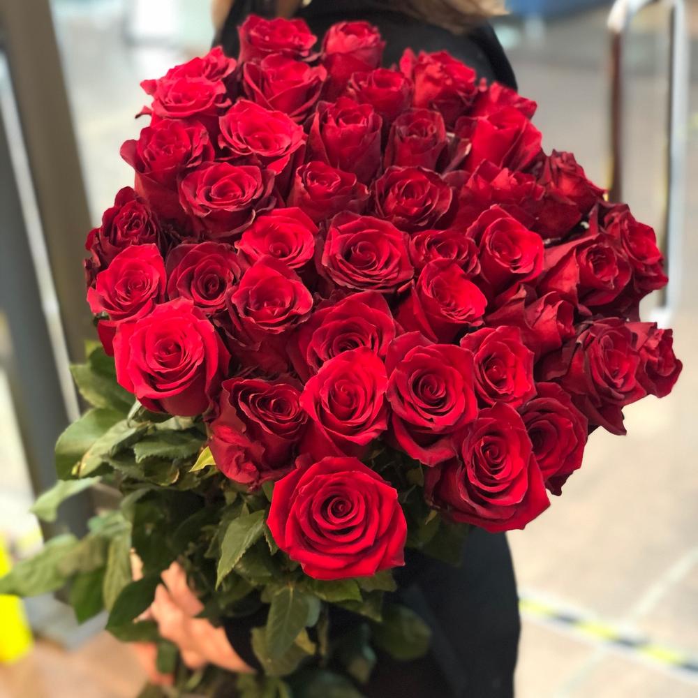 Роза эквадор 90 см – 35 шт.Лента атласная – 1 шт.Пленка прозрачная – 1 шт.