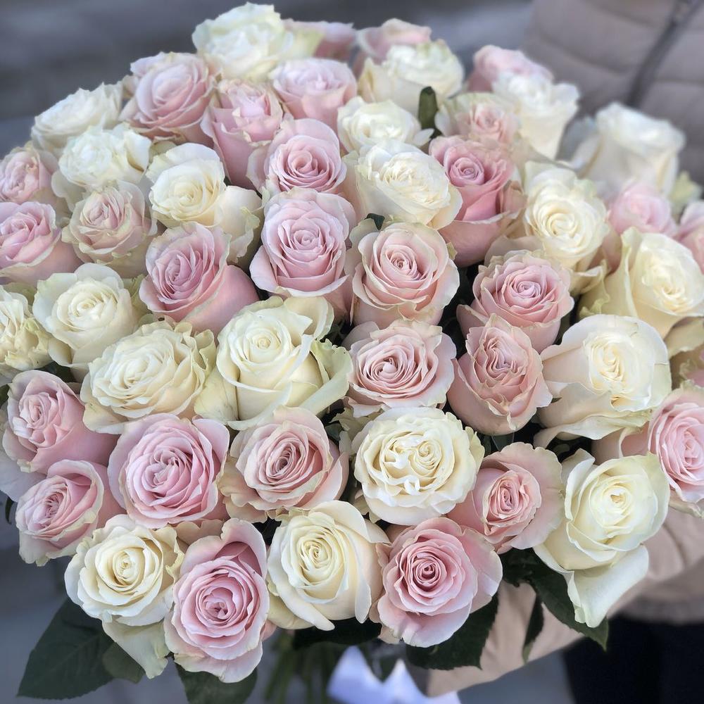 Букет из 51 бело-розовой розы сорта Mondial и Pink Mondial