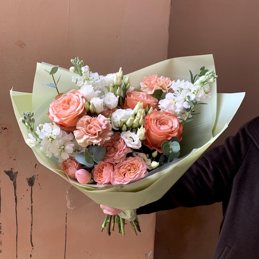 Маттиола – 3 шт.Эвкалипт – 1 шт.Лизиантус белый – 2 шт.Рускус сочи – 5 шт.Гвоздика карамель – 3 шт.Роза кахала – 3 шт.Роза кустовая пионовидная джульетта – 1 шт.Авторская упаковка – 1 шт.