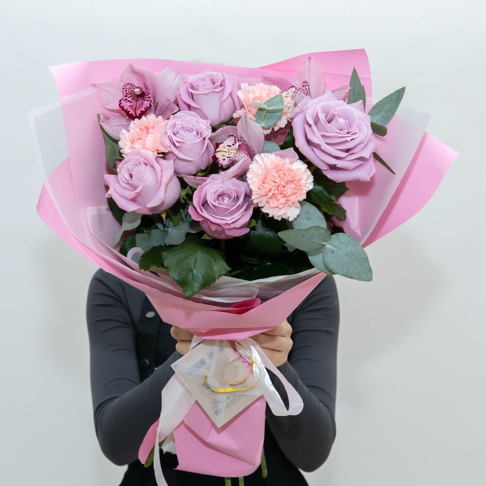 Авторский букет: орхидея розовая, диантус персиковый и роза розовая Маритим