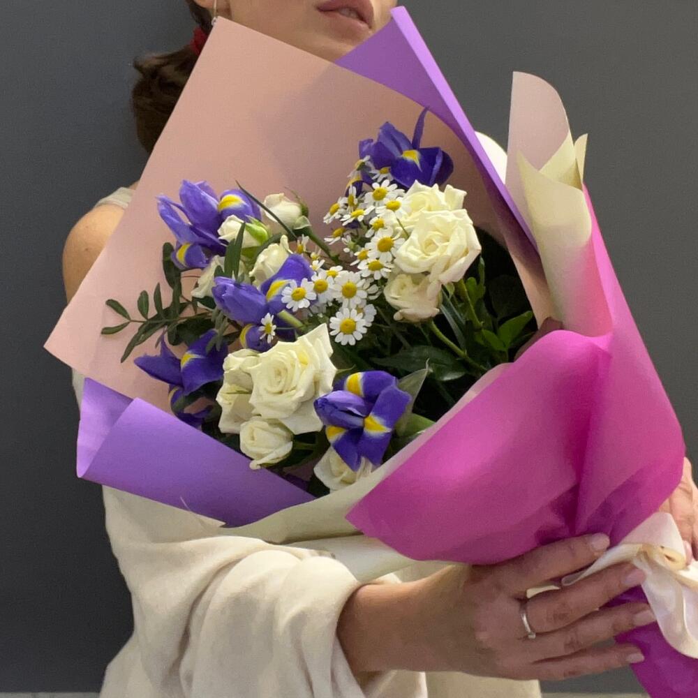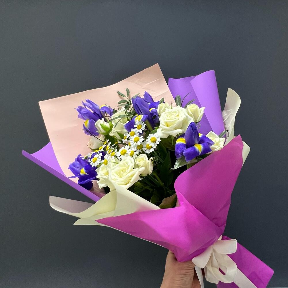Роза – 3 шт.Ирис – 5 шт.Матрикария – 1 шт.Фисташка – 1 шт.Упаковка дизайнерская – 1 шт.