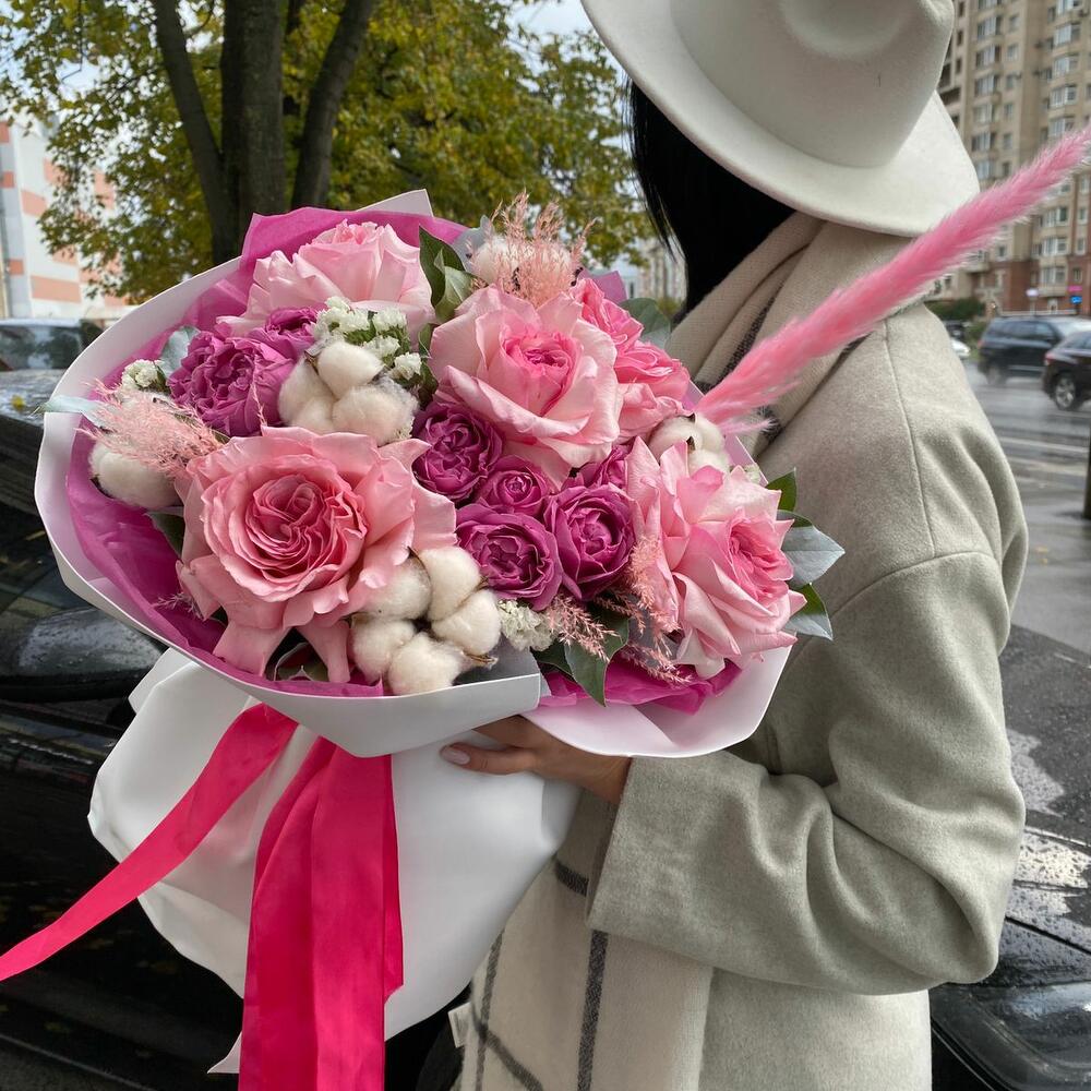 Роза – 5 шт.камыш декоративный – 1 шт.Хлопок – 5 шт.Роза пионовидная кустовая – 3 шт.Упаковка – 4 шт.Салал – 5 шт.Статица – 2 шт.мискантус – 4 шт.Сумка крафт – 1 шт.