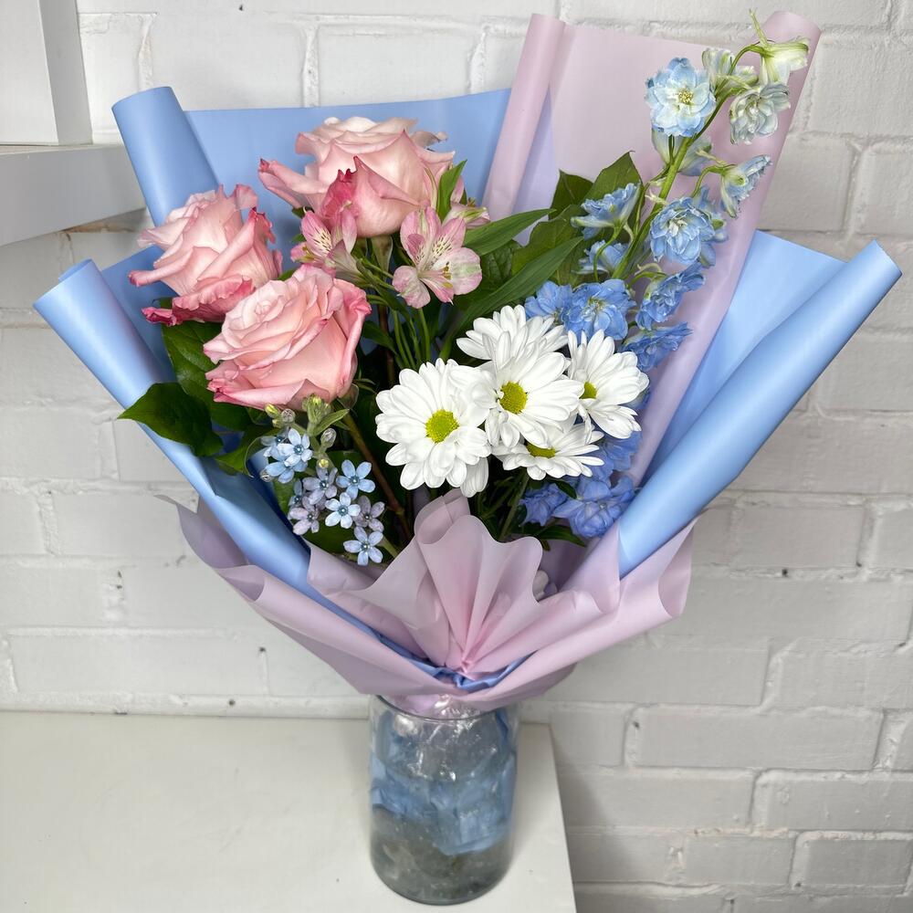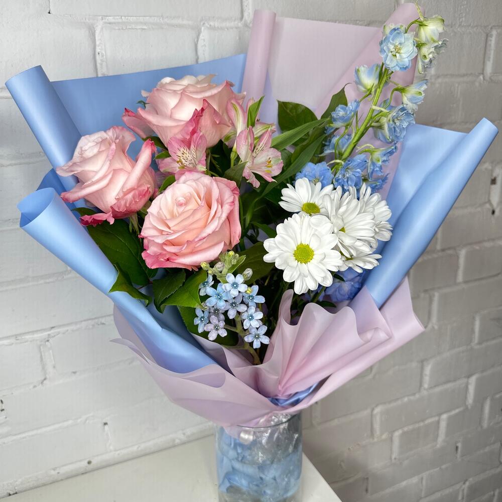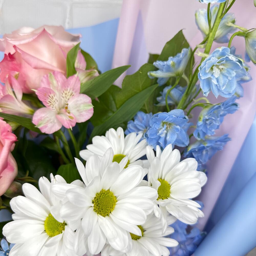 Роза Эквадор – 3 шт.Дельфиниум – 1 шт.Хризантема кустовая – 1 шт.Фисташка – 3 шт.Корейская упаковка – 3 шт.