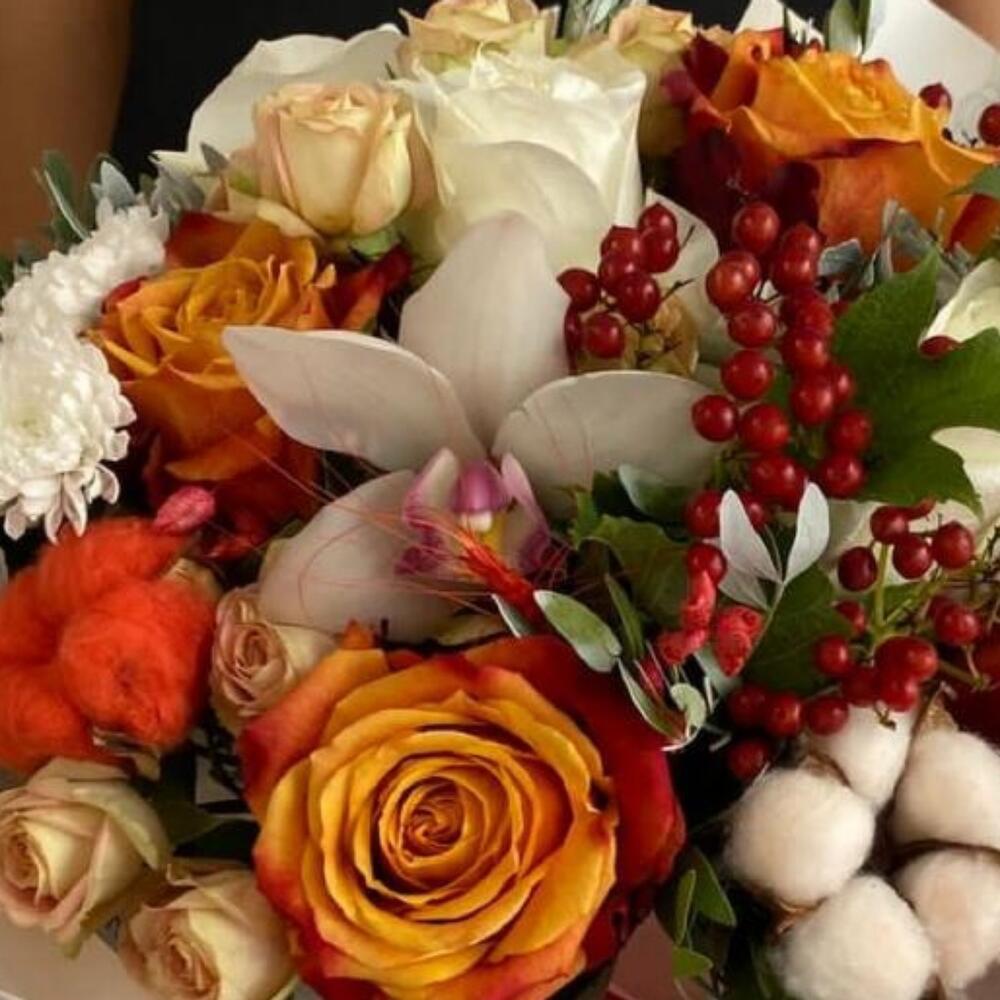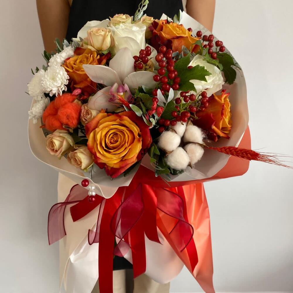 Роза Эквадор – 6 шт.Кустовая роза – 3 шт.Орхидея Цимбидиум – 1 шт.Калла – 1 шт.Хлопок – 2 шт.Сухоцветы – 3 шт.Фисташка – 3 шт.Салал – 3 шт.Пленка матовая – 6 шт.бант атласный – 2 шт.