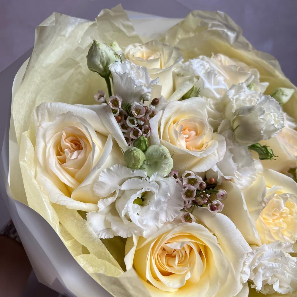роза candelight – 7 шт.Лизиантус (эустома) – 3 шт.Хамелациум – 3 шт.декоративная упаковка – 1 шт.Атласная лента – 1 шт.