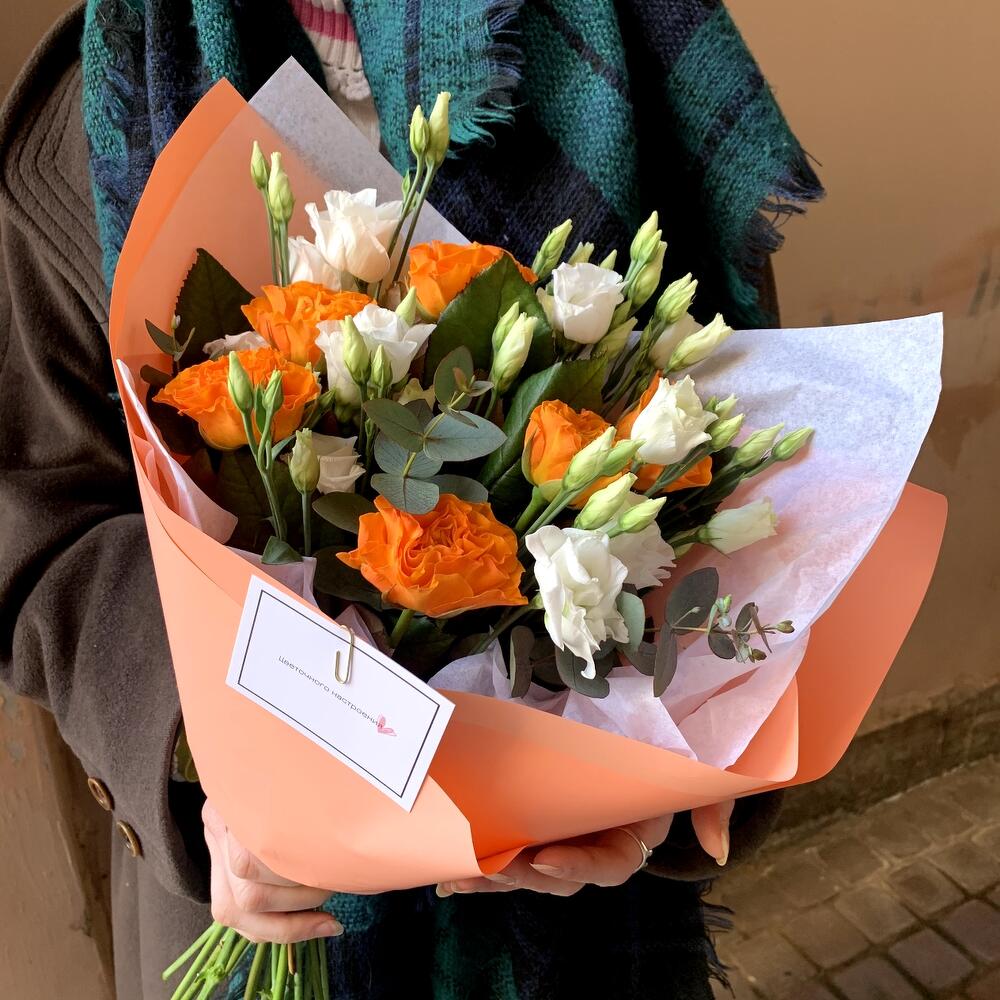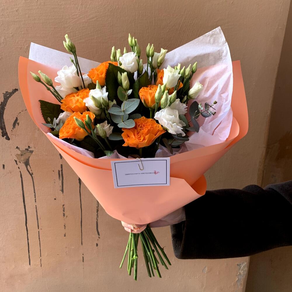Эвкалипт – 1 шт.Лизиантус белый – 2 шт.Авторская упаковка – 1 шт.роза россия оранжевая – 7 шт.