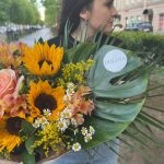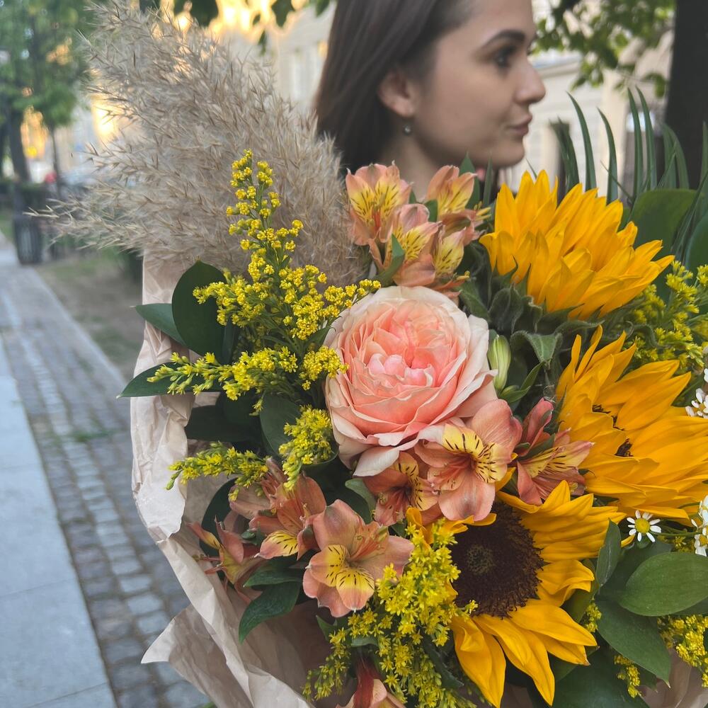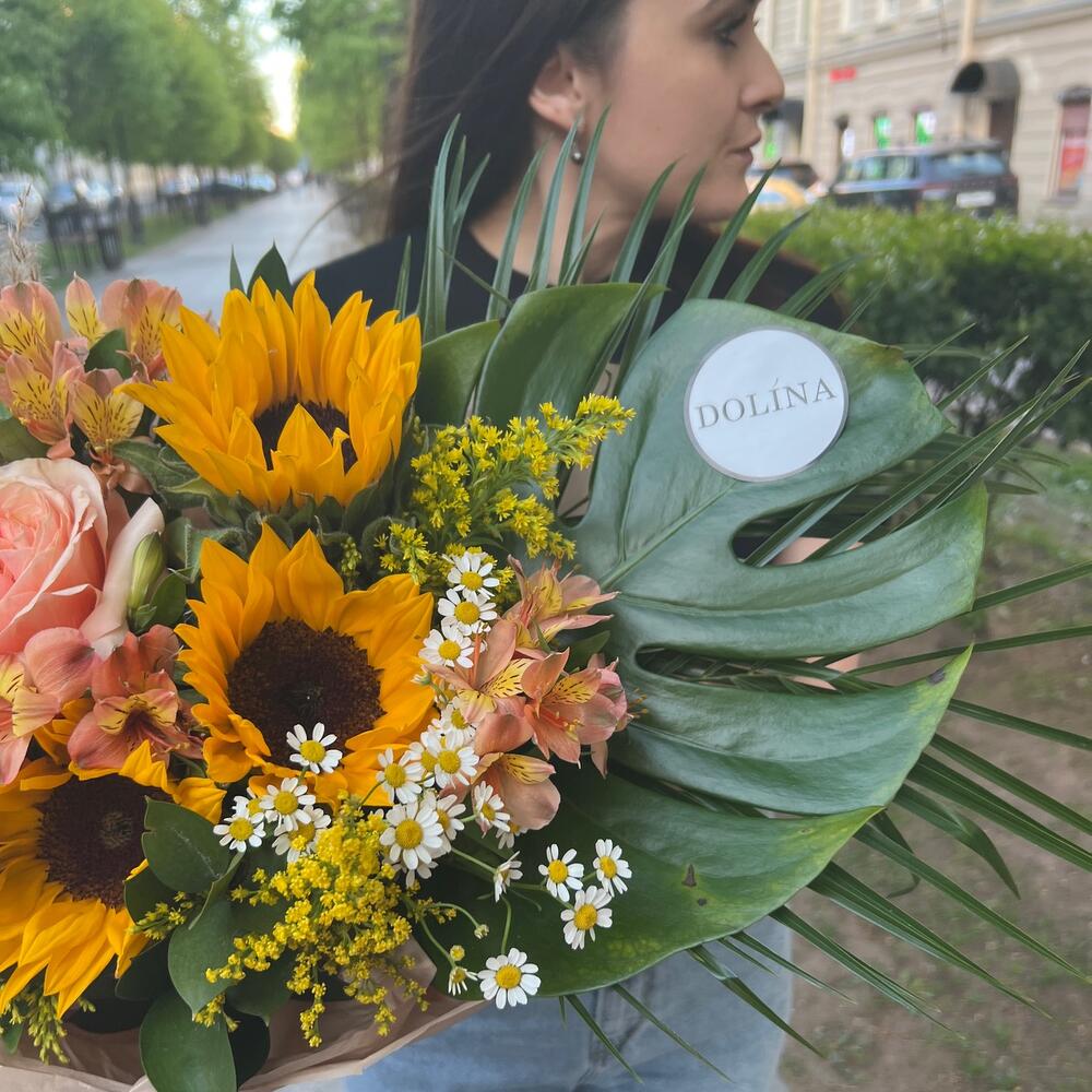 Подсолнух – 3 шт.Роза пионовидная – 1 шт.Альстромерия – 3 шт.Зелень – 3 шт.Монстера – 1 шт.Солидаго – 4 шт.Матрикария (Ромашка Камила) – 1 шт.Сухоцветы – 1 шт.Упаковка дизайнерская – 1 шт.