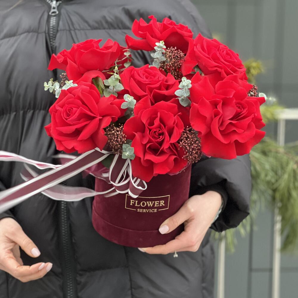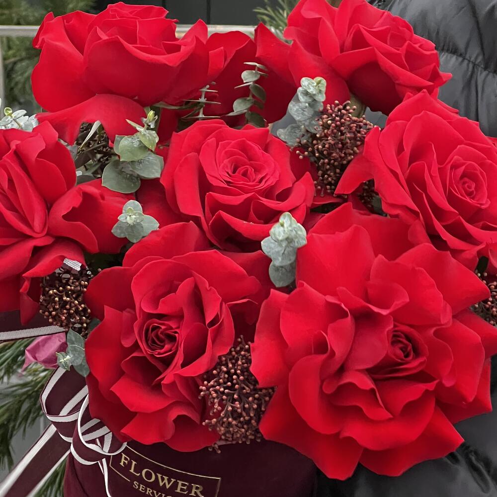 Роза красная – 11 шт. Эвкалипт – 1 шт. Скиммия – 1 шт. Коробка бархат – 1 шт. Оазис – 1 шт.