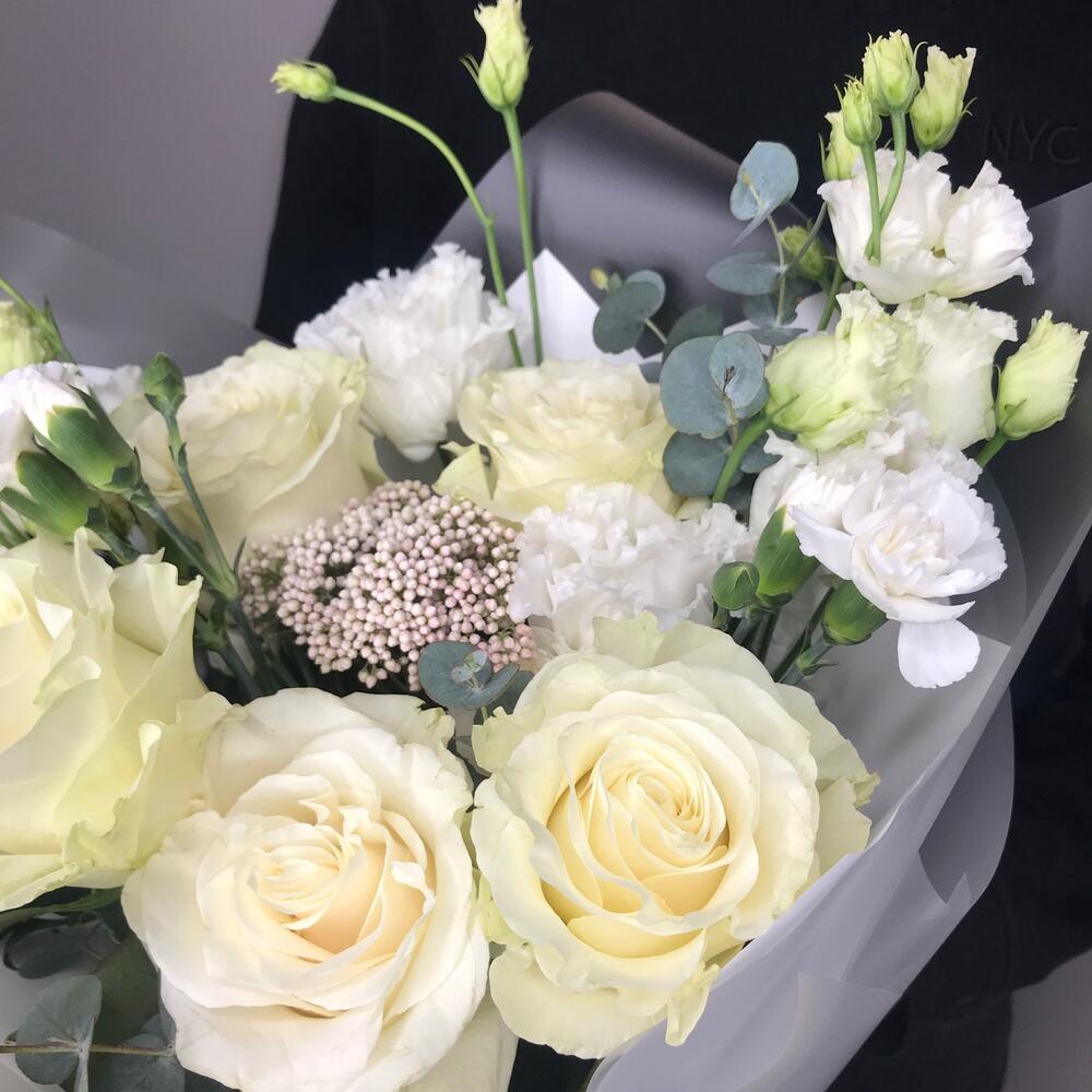 Лизиантус – 2 шт.Озотамнус – 1 шт.Эвкалипт – 2 шт.Гвоздика кустовая – 3 шт.Роза белая – 5 шт.Упаковка дизайнерская – 1 шт.комплимент от polyanka – 1 шт.