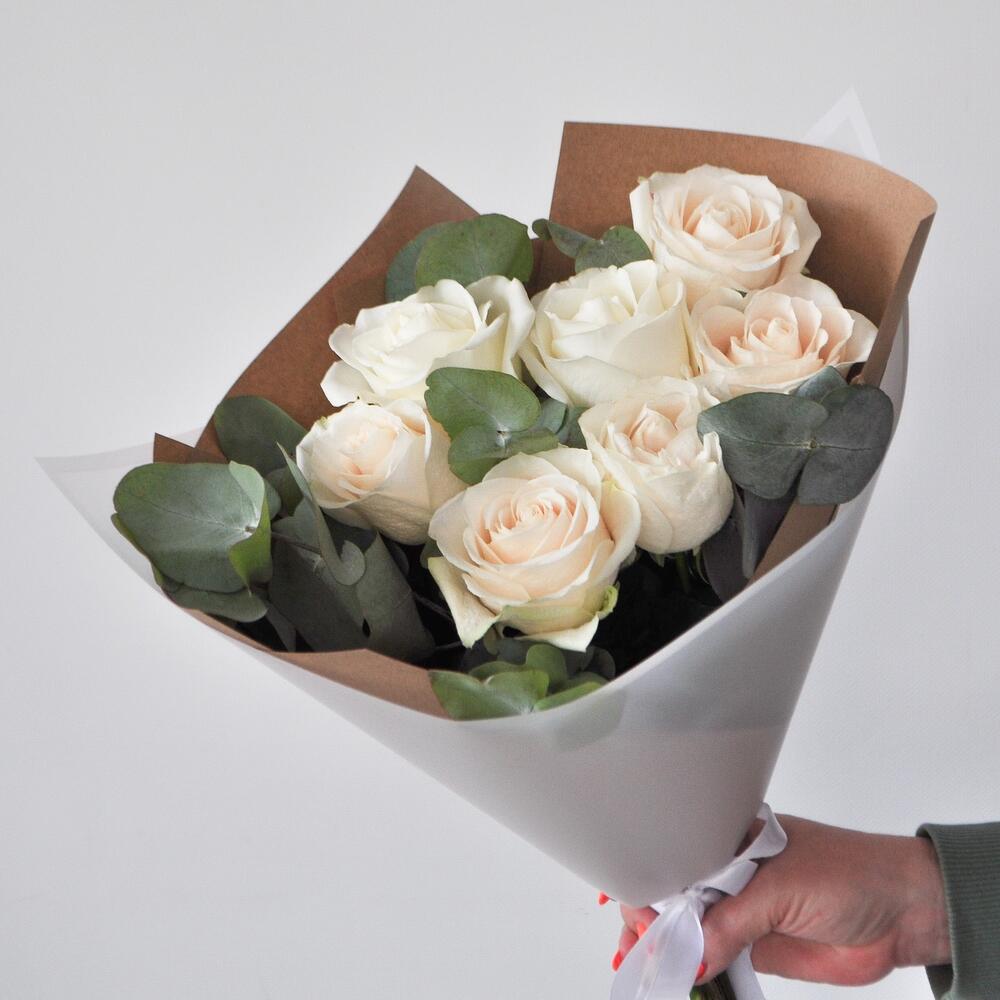 Белые розы и Эвкалипт ( 7 штук )