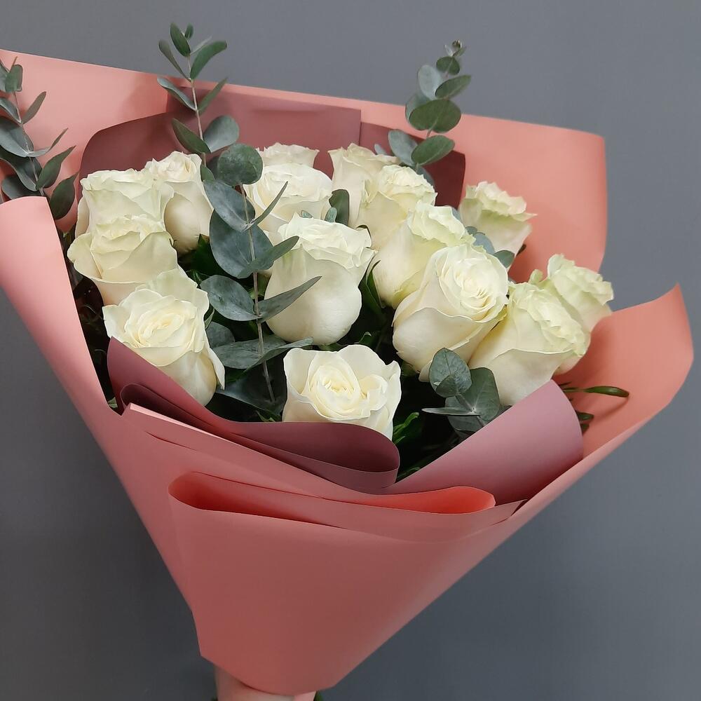 Белые розы и Эвкалипт ( 15 штук )