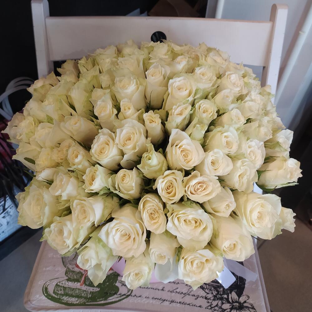Роза белая – 101 шт.Коробка шляпная – 1 шт.