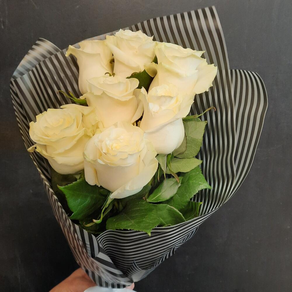 белые розы эквадор 60 см – 7 шт.Калька упаковка – 1 шт.Лента атласная – 2 шт.