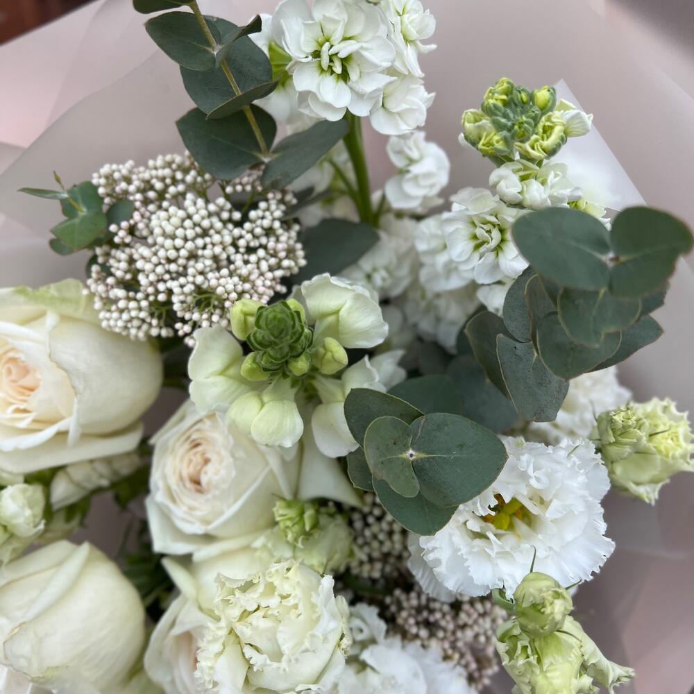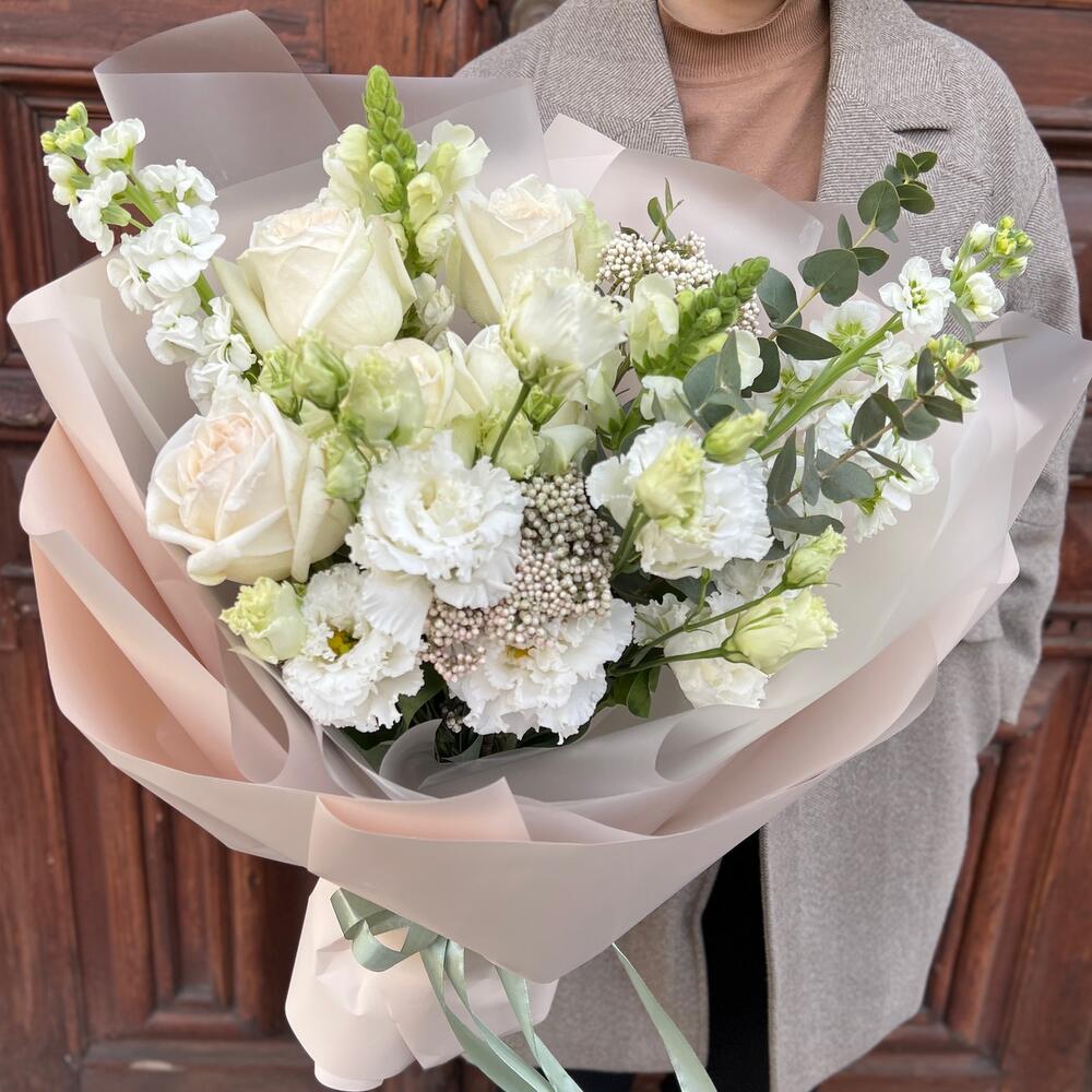 Маттиола – 3 шт.Озотамнус – 3 шт.Эвкалипт – 3 шт.Лента атласная – 2 шт.Пленка матовая – 9 шт.Эустома белая махровая – 2 шт.антиринум – 2 шт.роза вайт о хара( ароматная) – 5 шт.
