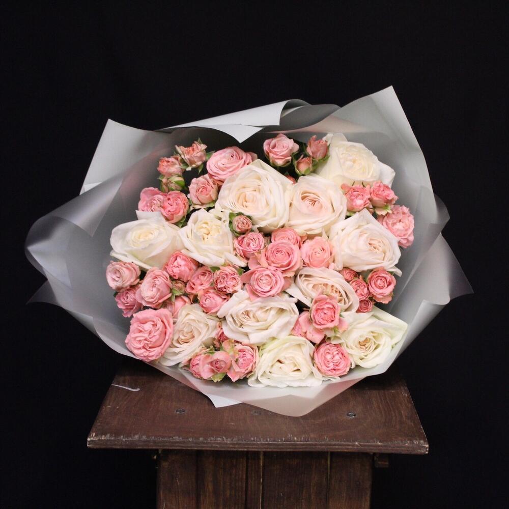 роза пионовидная white o’hara – 11 шт.Роза кустовая пионовидная мадам бомбастик – 12 шт.Пленка дизайнерская – 5 шт.Лента атласная – 1 шт.