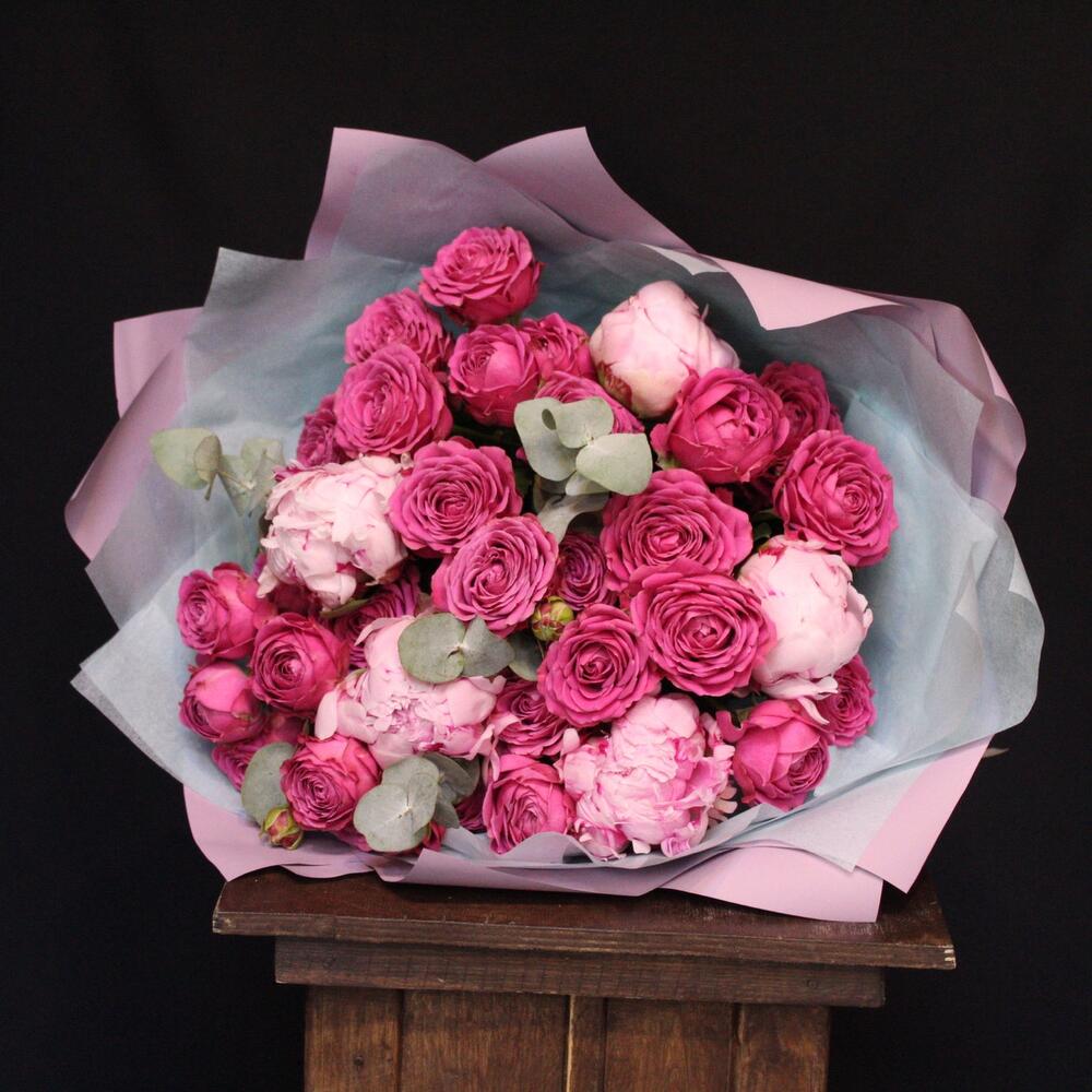 Эвкалипт – 2 шт.Тишью – 3 шт.Пион Сара Бернар – 5 шт.Пленка дизайнерская – 3 шт.роза кустовая пионовидная классик сенсейшн – 6 шт.