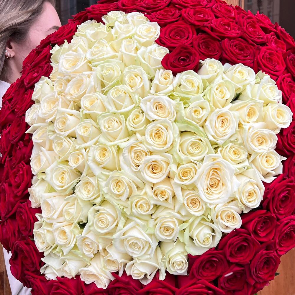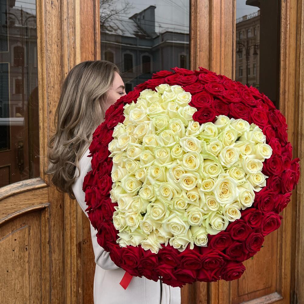 Роза красная 60 см – 101 шт.Роза белая 60 см – 50 шт.Лента атласная – 3 шт.