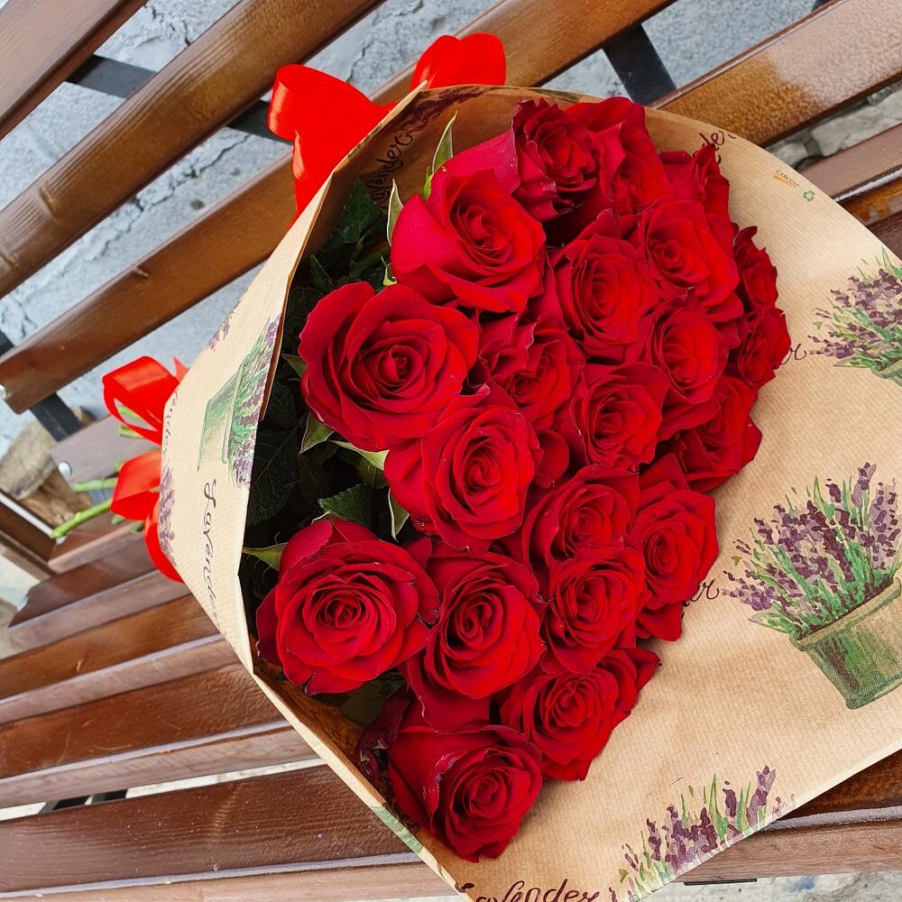 Роза Эквадор 60 см – 21 шт.Крафт – 1 шт.Лента атласная – 1 шт.