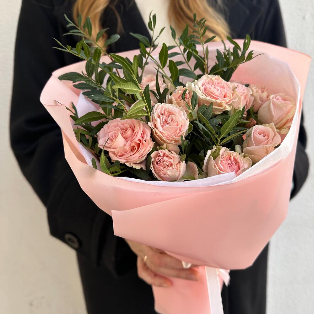 кустовая роза бомбастик 40 см – 5 шт. Писташ – 3 шт. Упаковка дизайнерская – 1 шт.
