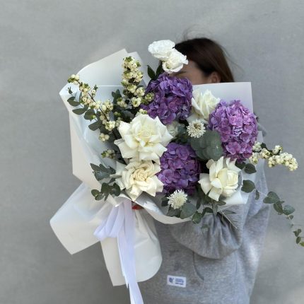 Гортензия – 3 шт. Хризантема одноголовая – 6 шт. Роза – 2 шт. Вибурнум – 4 шт. Гвоздика – 1 шт.