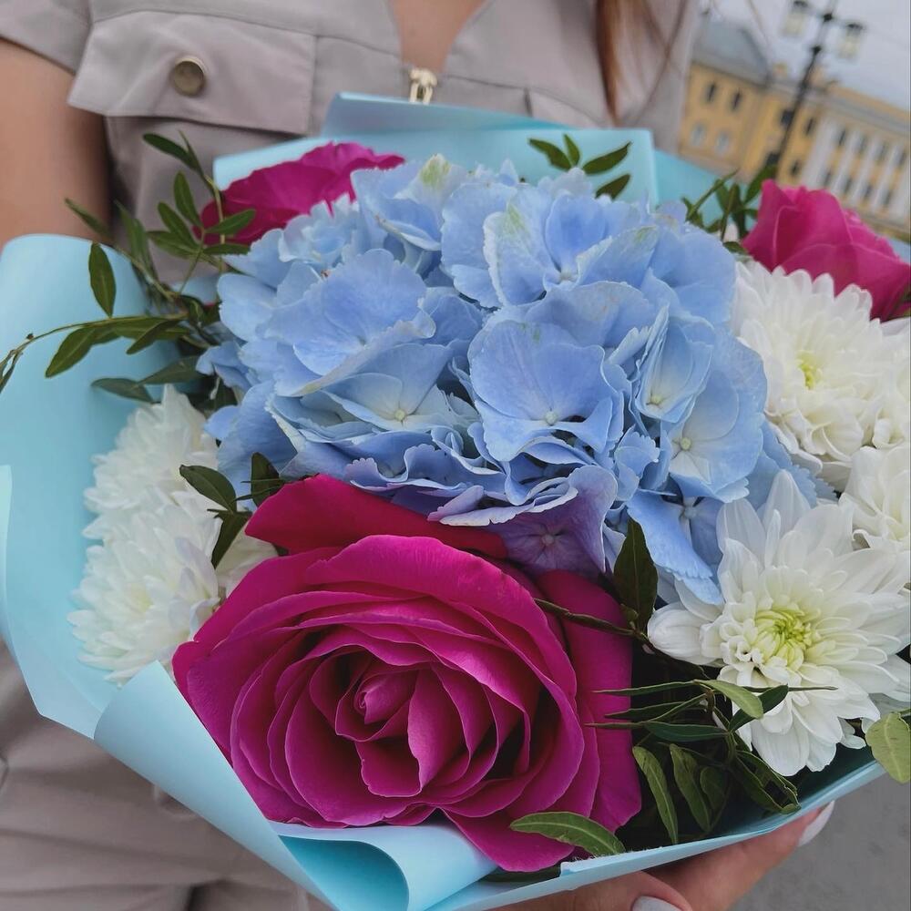 Гортензия – 1 шт.Роза – 3 шт.Хризантема кустовая – 3 шт.Фисташка пучок – 1 шт.бумага дизайнерская – 1 шт.Лента – 1 шт.